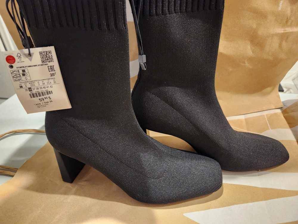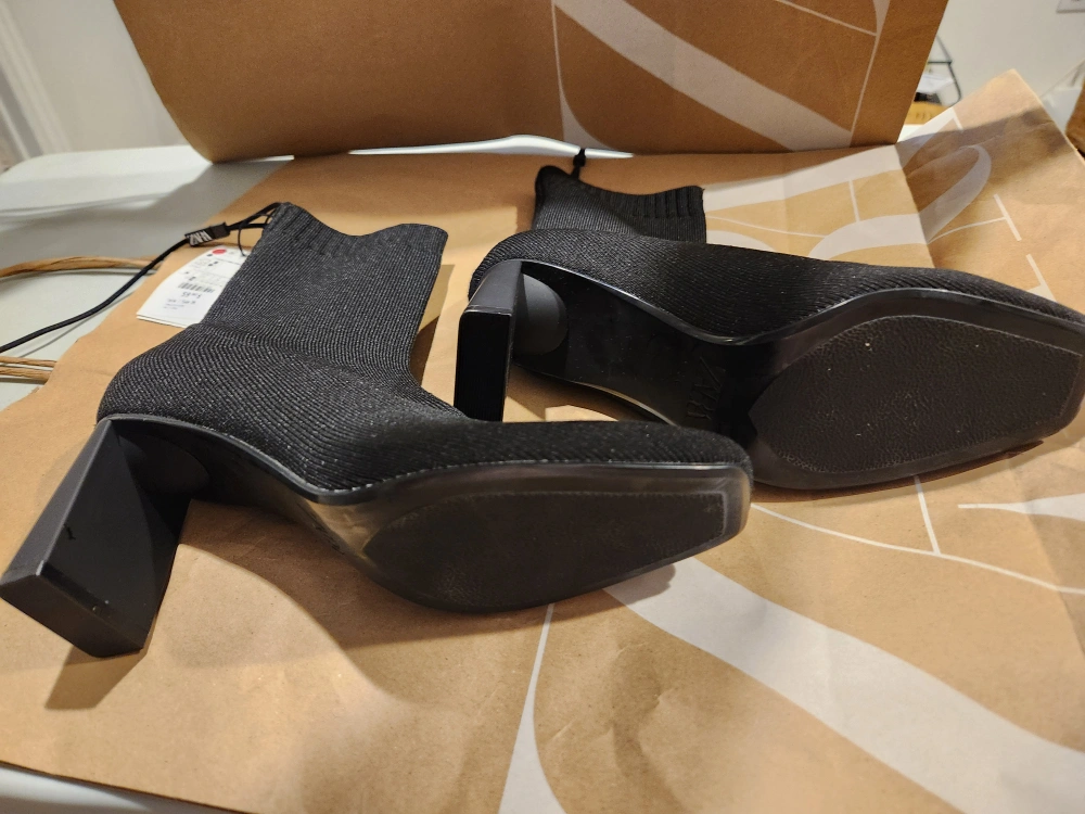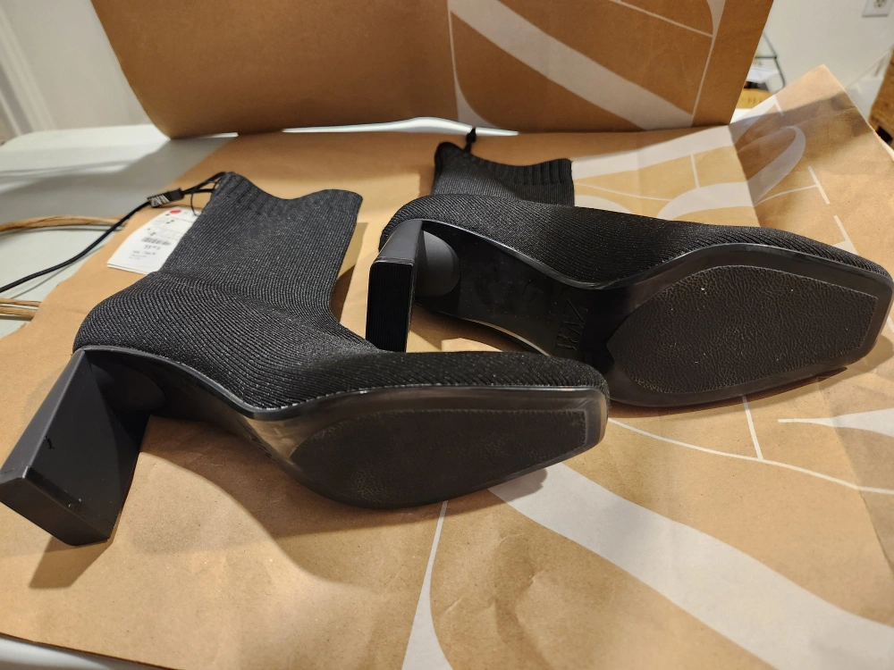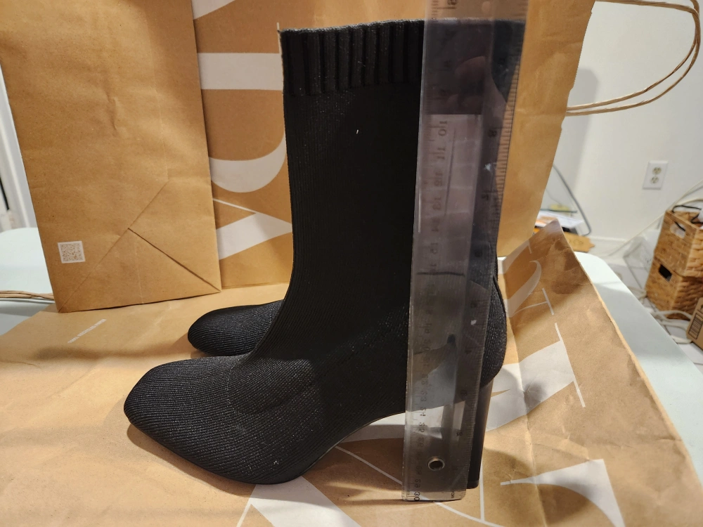 Black knit booties with a block heel. Size 36. Approximately 3 inches in height. Made in China. Cash Only. Price is firm. Pickup is at 180 Enterprise Blvd, Markham