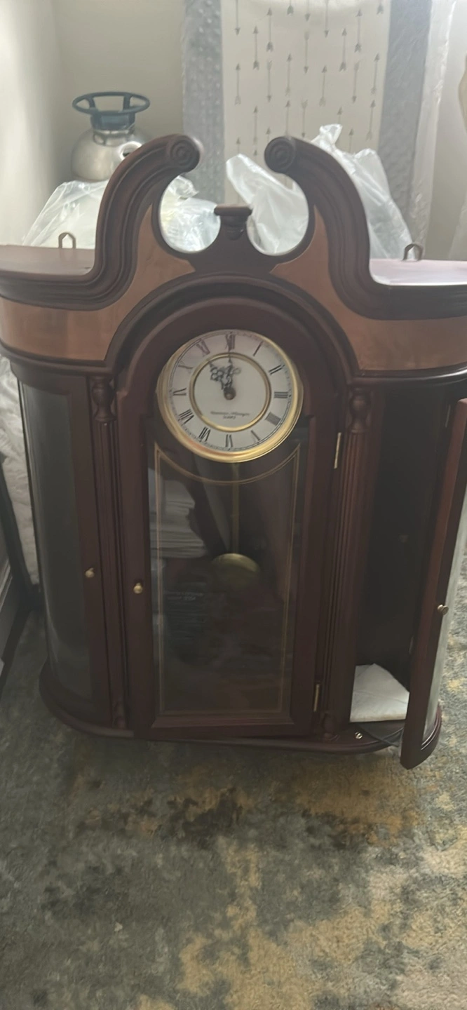Selling a beautiful wooden hanging curio cabinet w/clock, possibly Howard Miller. It's in good condition but clock not working and would make a great addition to any home! Glass shelves on both sides