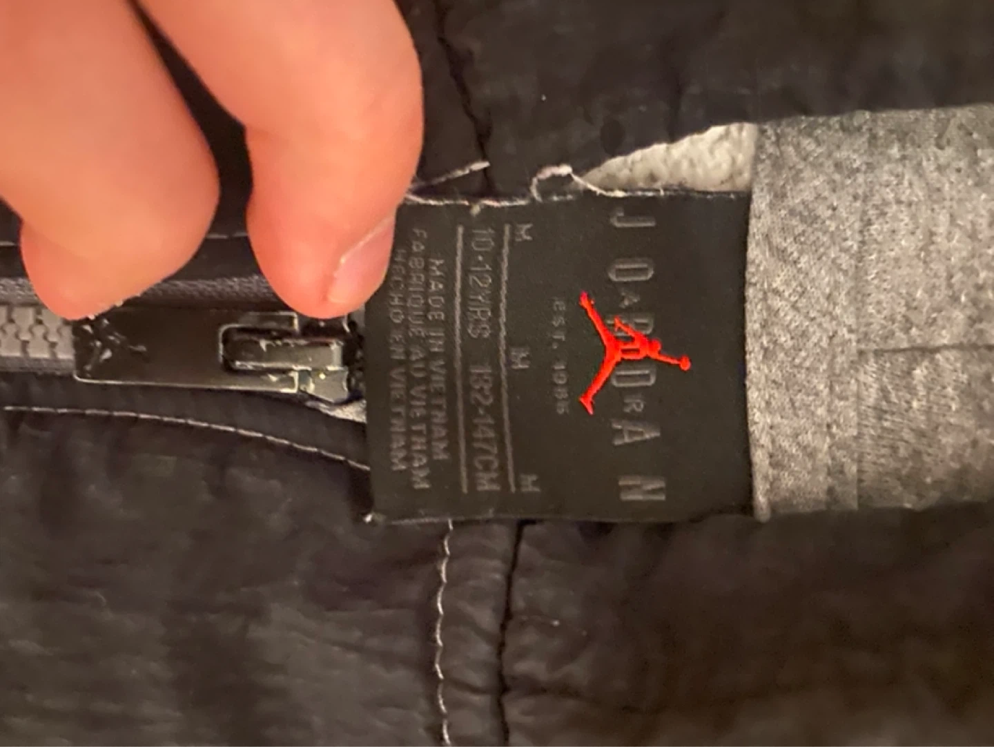 This Jordan tracksuit set includes a zip-up hoodie and matching joggers. Set is grey with black accents and features the Jumpman logo. Kids' size medium (10-12 years).