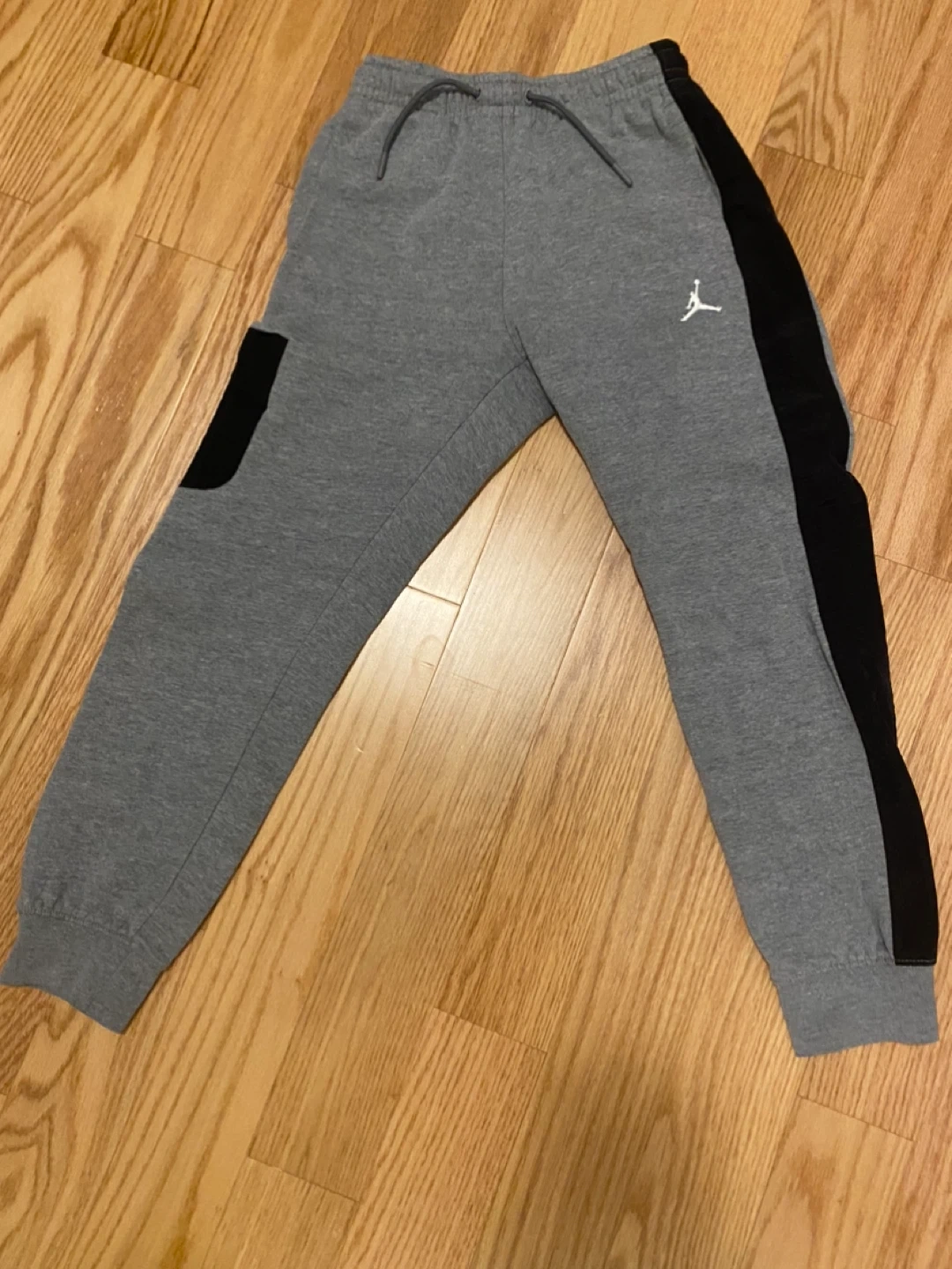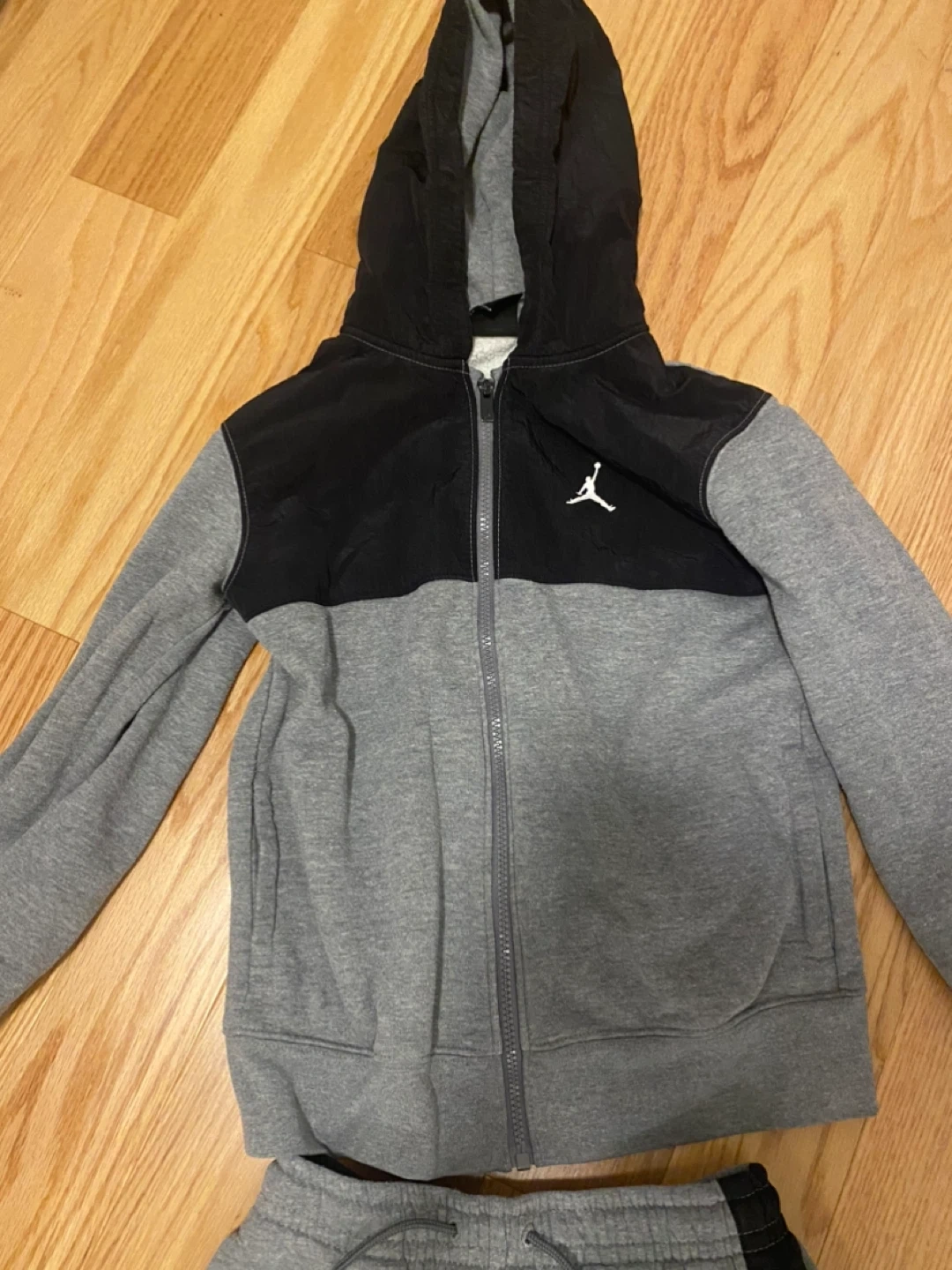 This Jordan tracksuit set includes a zip-up hoodie and matching joggers. Set is grey with black accents and features the Jumpman logo. Kids' size medium (10-12 years).