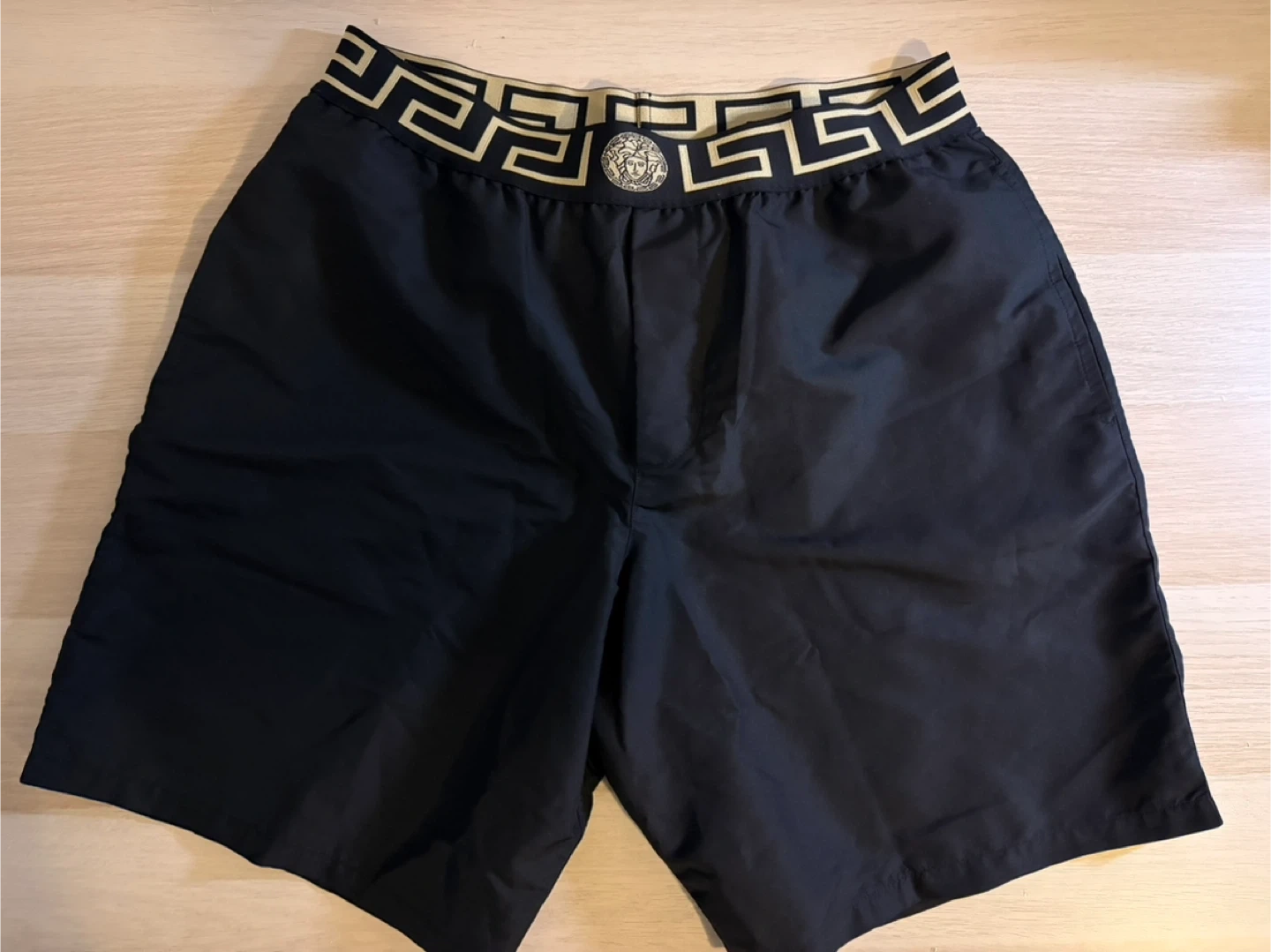 Versace black swim trunks featuring the iconic Greek key and Medusa head motif on the waistband.