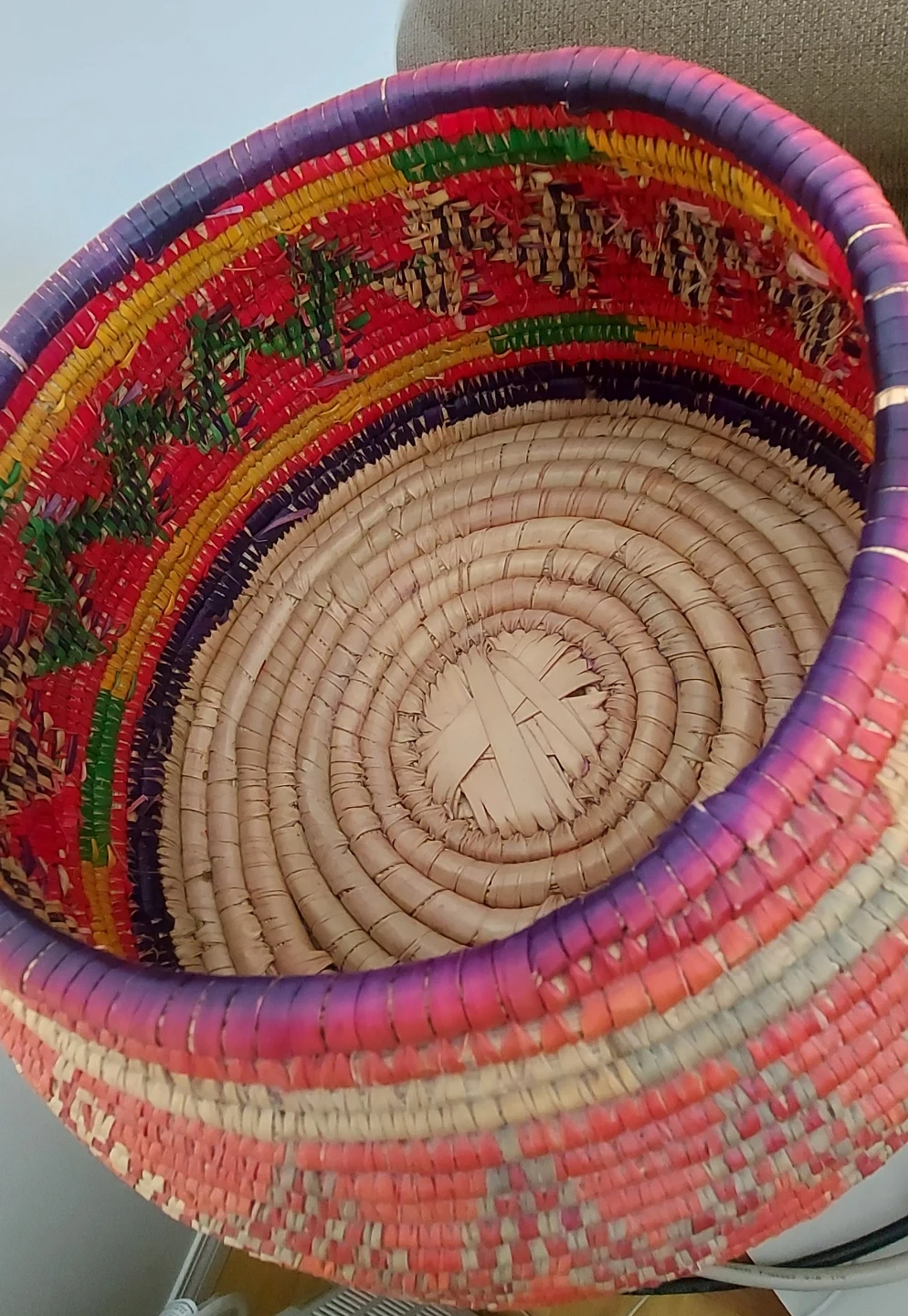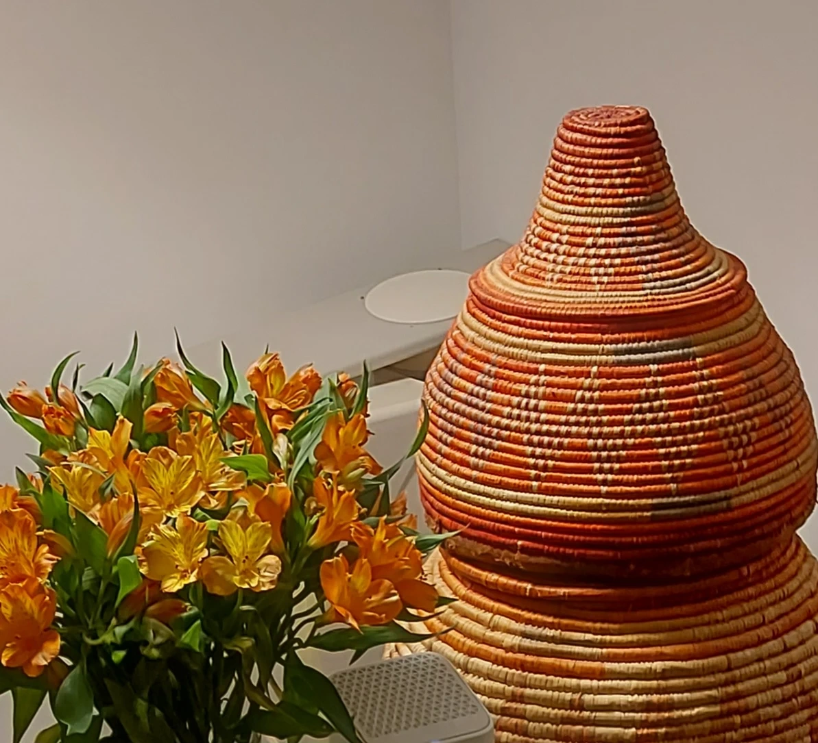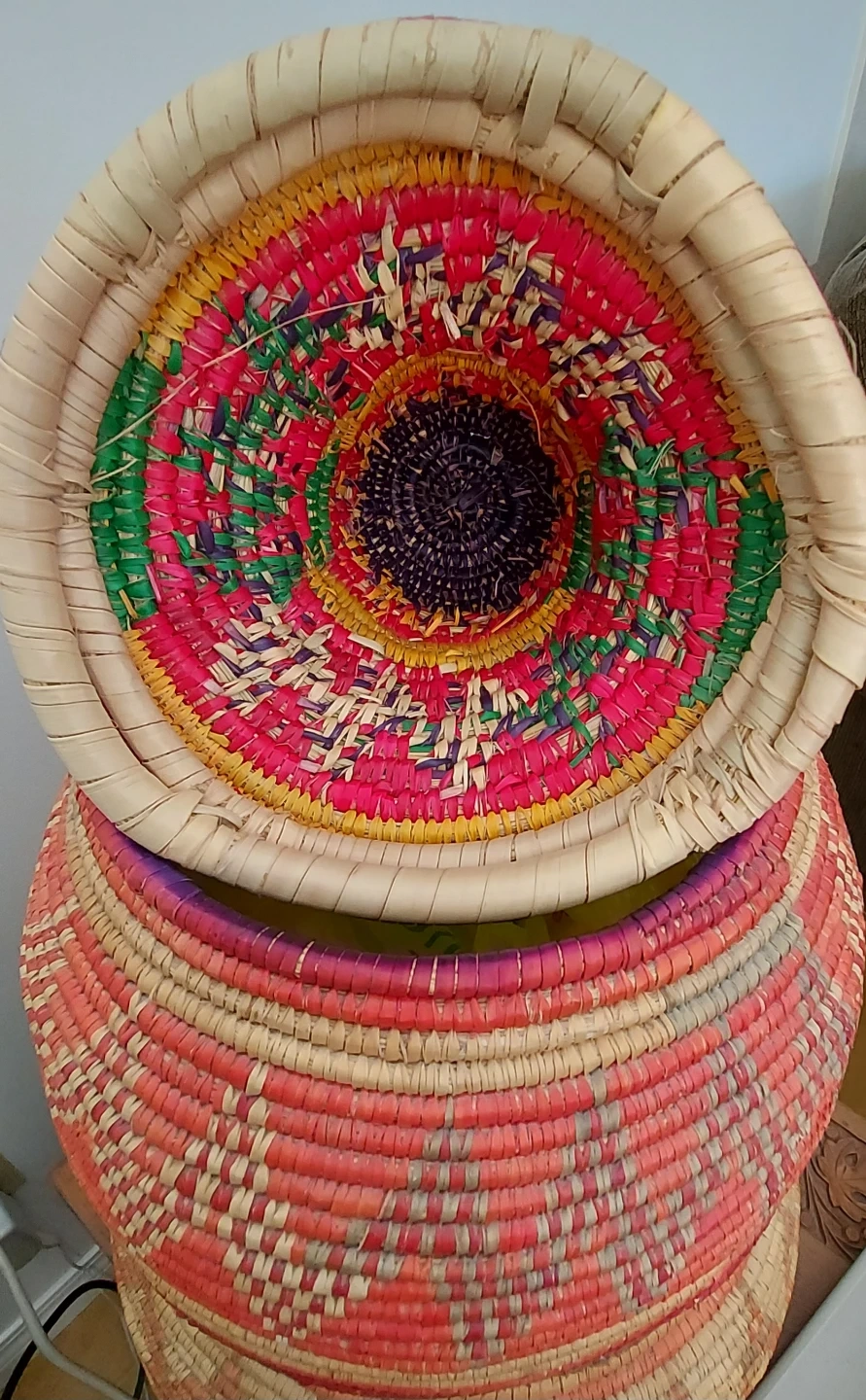 This hand-woven basket features a unique conical lid. It's crafted in the Arabian peninsula from natural fibres with an orange, tan, and green striped pattern, It has a suede-covered bottom. Great for storing items or as a decorative piece in your home!