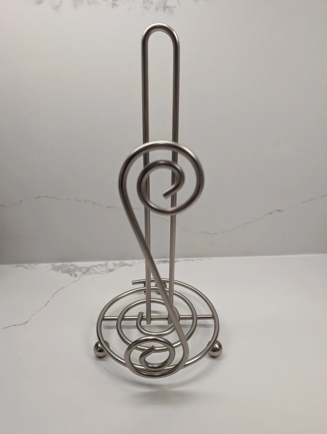 A decorative silver metal paper towel holder. Features a spiral scroll design on the side and a circular base with small feet. It's perfect for keeping your kitchen counter tidy. Holds one standard roll of paper towels.