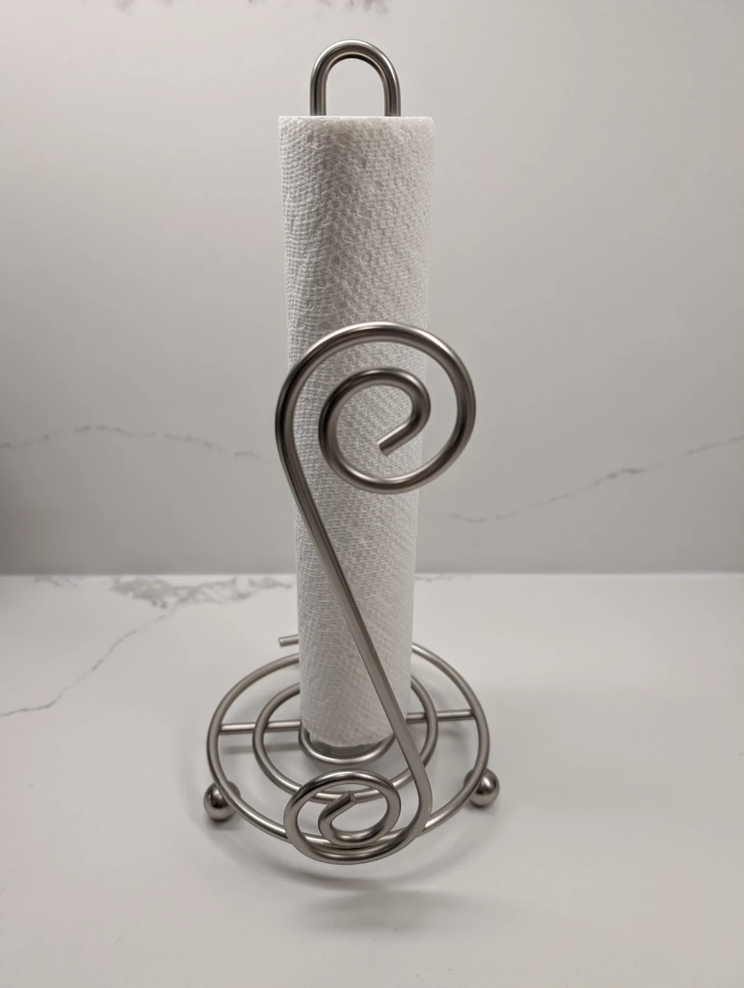 A decorative silver metal paper towel holder. Features a spiral scroll design on the side and a circular base with small feet. It's perfect for keeping your kitchen counter tidy. Holds one standard roll of paper towels.