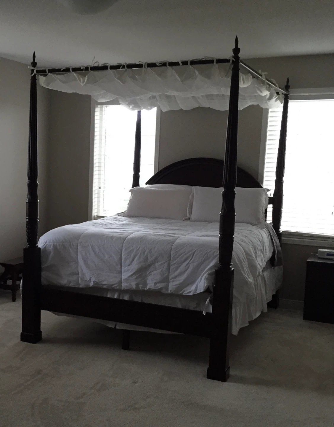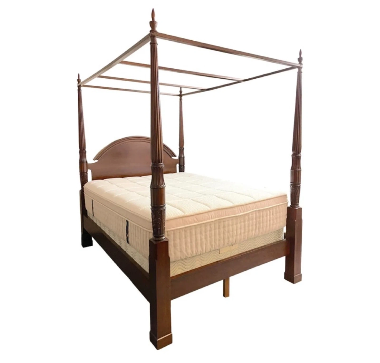 This is a gorgeous, stately mahogany four poster bed with a removable canopy made by the Bombay Company. There are beautiful carvings on the posts. The canopy support can be removed so it can be used just as a four poster bed.