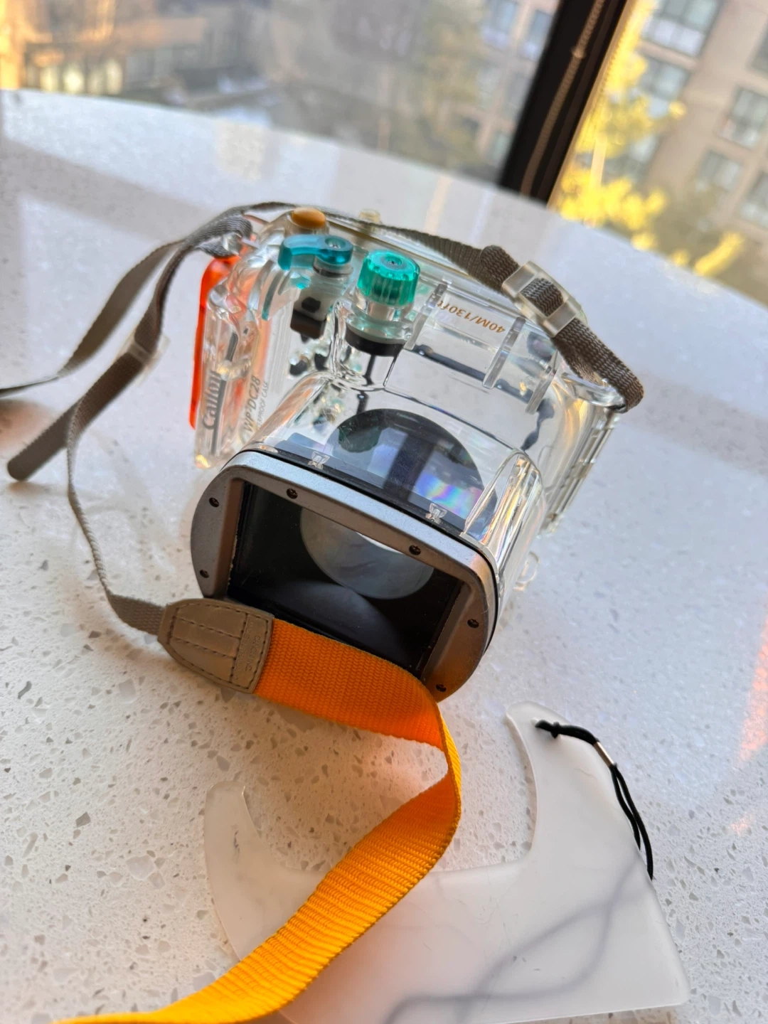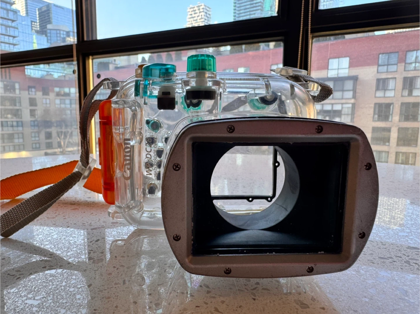 This is a Canon WP-DC58 underwater camera housing. It's made of clear polycarbonate plastic with green and orange accents. It comes with a neck strap and is designed for specific Canon camera models.