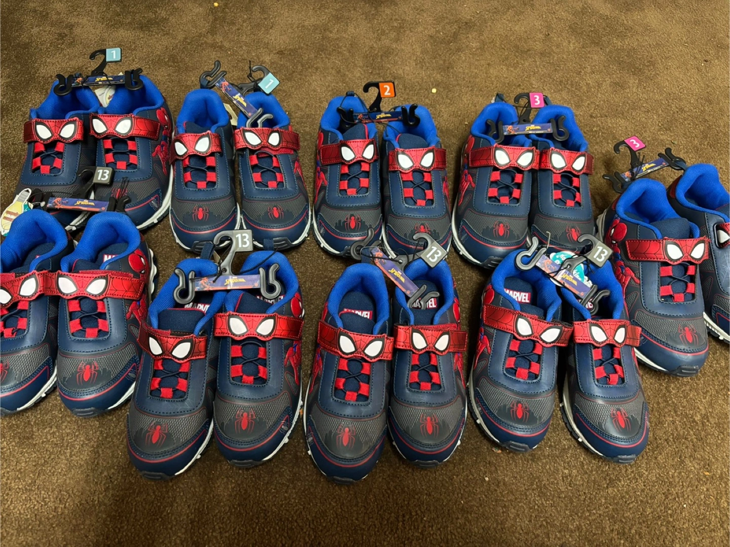 Kids marvel spider man shoes. These sneakers feature a blue and red colour scheme. The design includes a spider web pattern and Spider-Man face details. A great purchase for kids that need a fun and fashionable shoe. Please check the pictures for size reference.