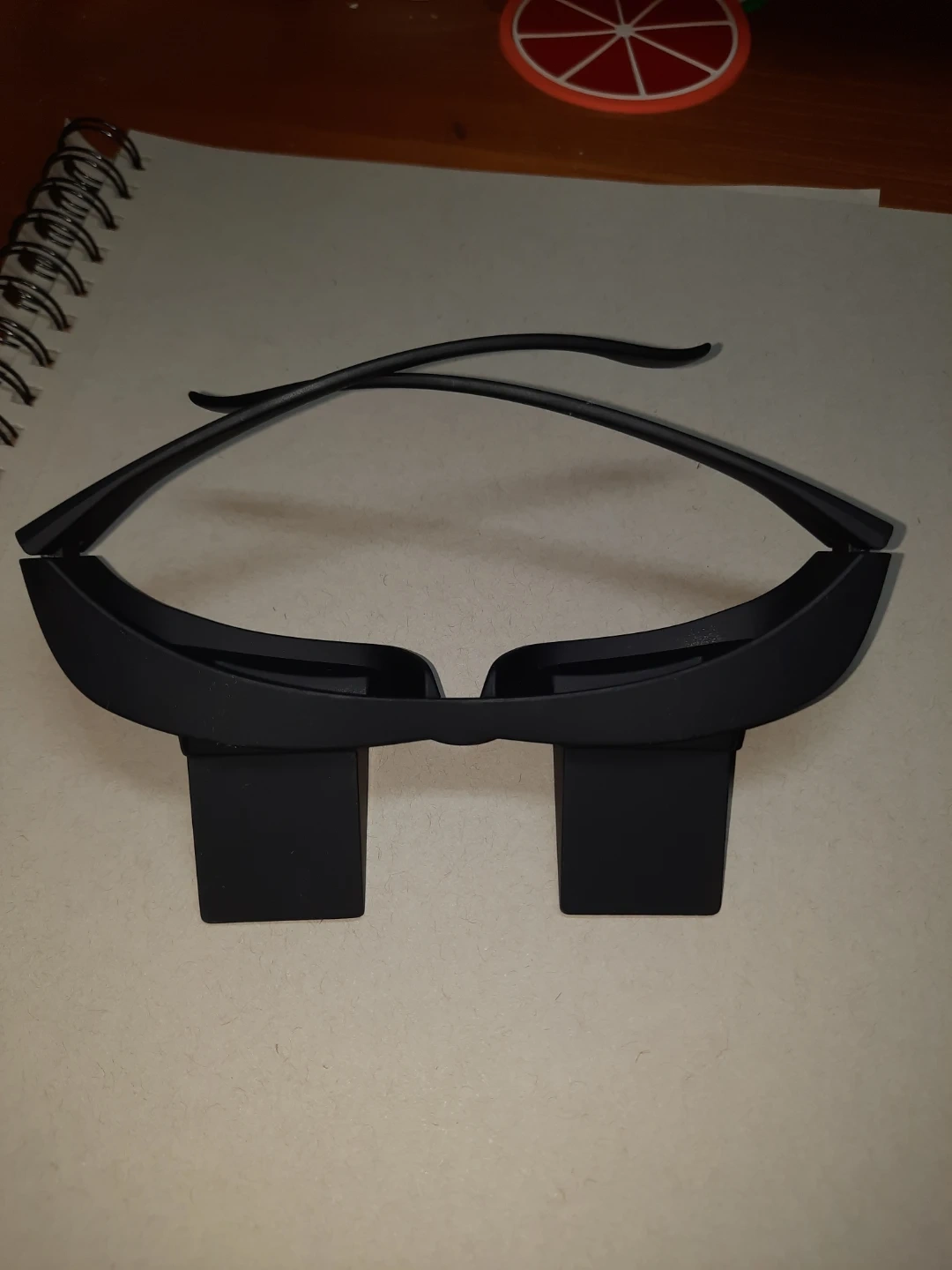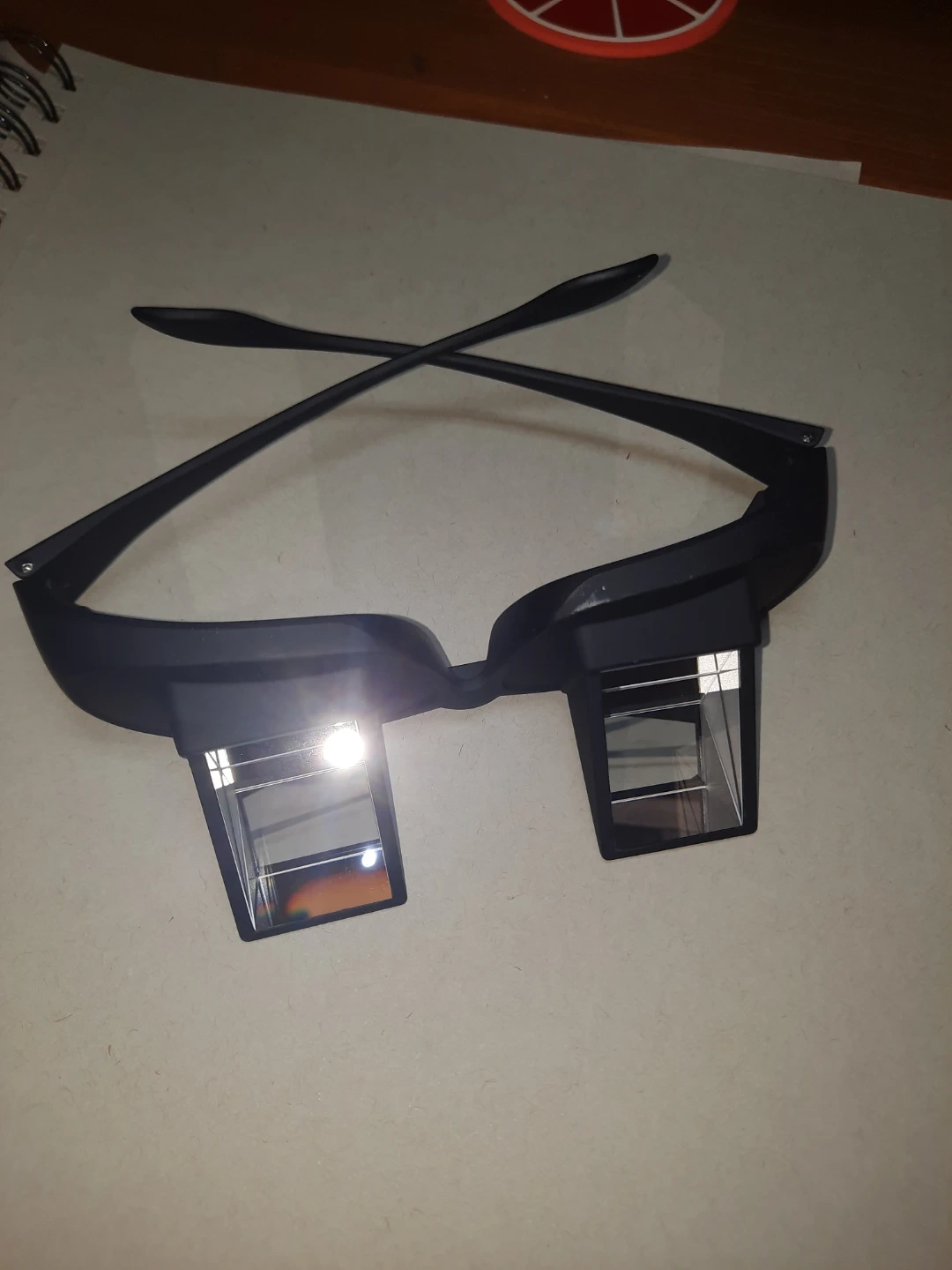 These are horizontal glasses that allow you to watch TV or read while lying down. They're made of plastic and come in black. They help reduce neck strain.