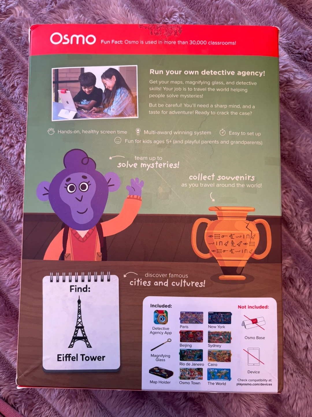 Solve mysteries around the world with this fun Osmo Detective Agency game. It includes the Detective Agency App, a magnifying glass, and a map holder. Designed for kids ages 5 and up, it offers hands-on, healthy screen time. Play beyond the screen and discover famous cities and cultures!