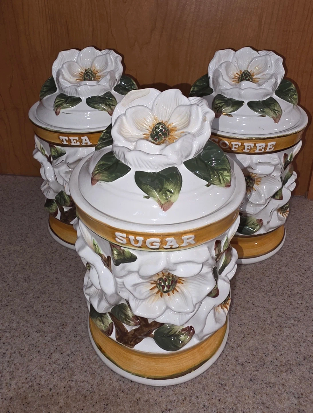 These canisters are made of ceramic and feature a hand-painted design of white magnolia flowers and green leaves with gold-colored banding by K&K brand manufactured in china. The set includes canisters labeled for tea, coffee, and sugar. Made in the early 2000's. The lid of the sugar canister has a chip on the Magnolia flower.