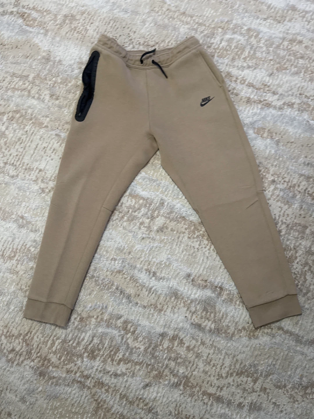 Tan Nike Tech Fleece joggers with a zippered side pocket and drawstring waist. These comfortable pants are made from a soft, durable material. They're great for everyday wear or athletic activities!