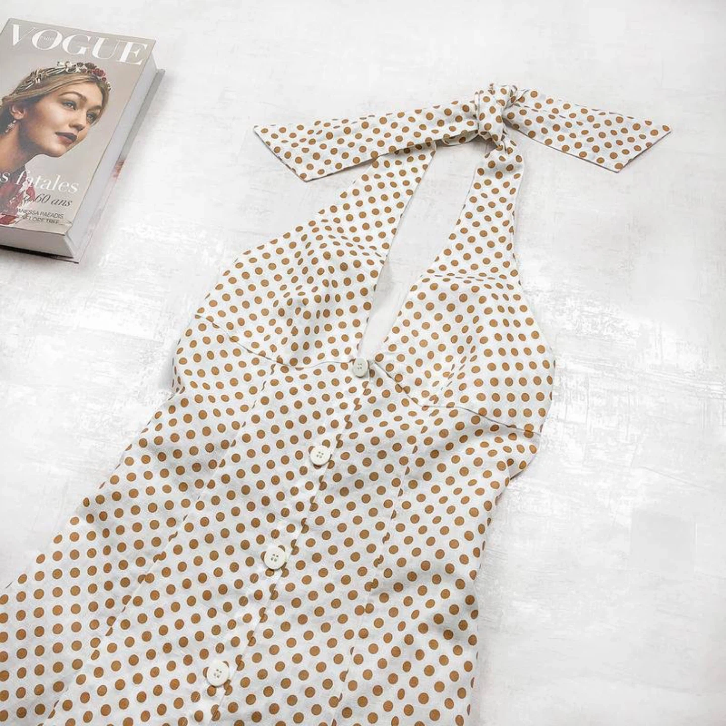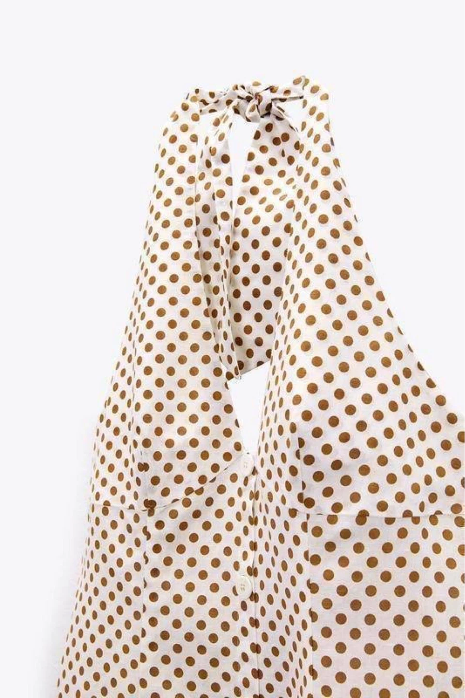 Elegant cream midi dress with brown polka dots that add a vintage charm and light summer elegance. Features a deep neckline with a tie at the neck and an open back, with no zipper or closure.