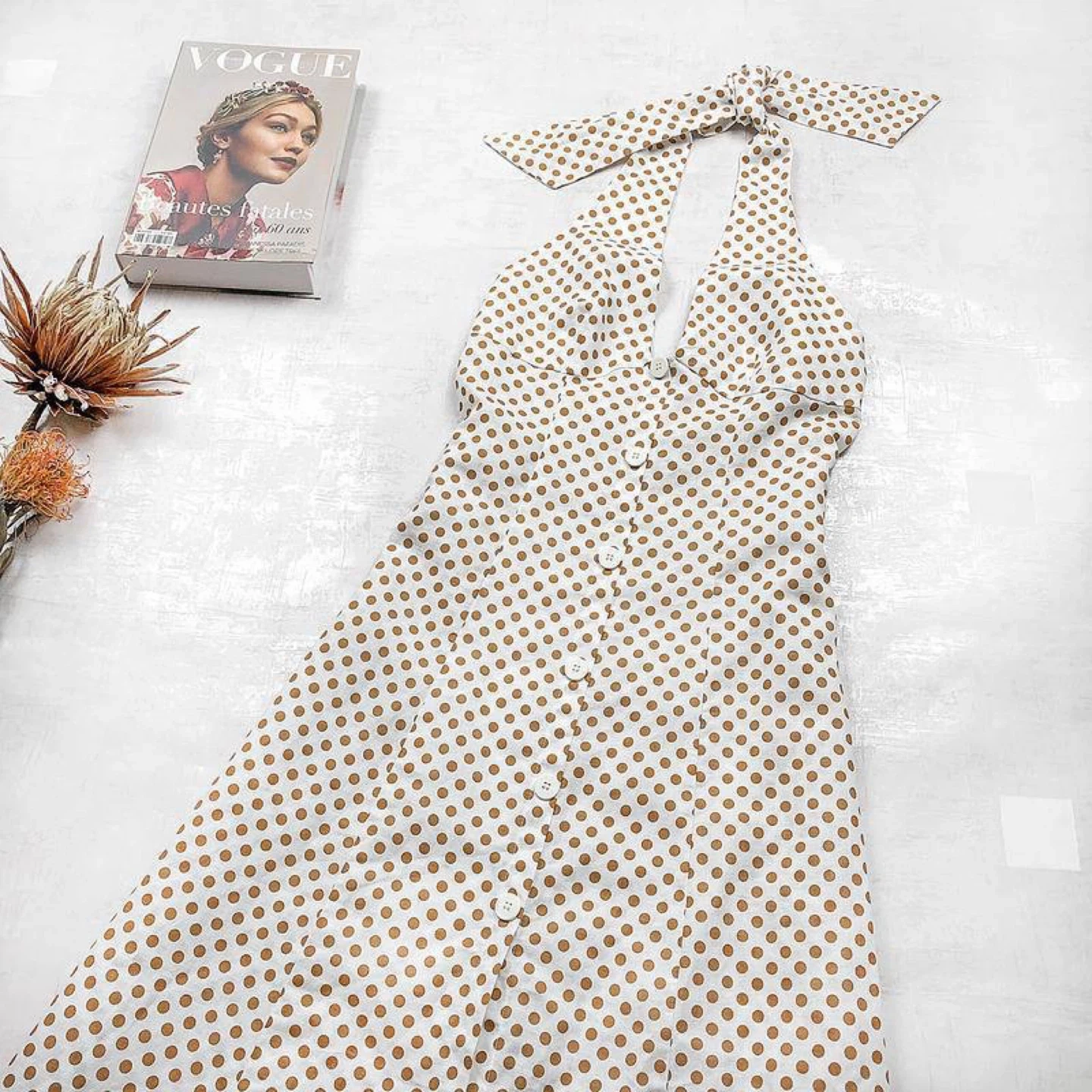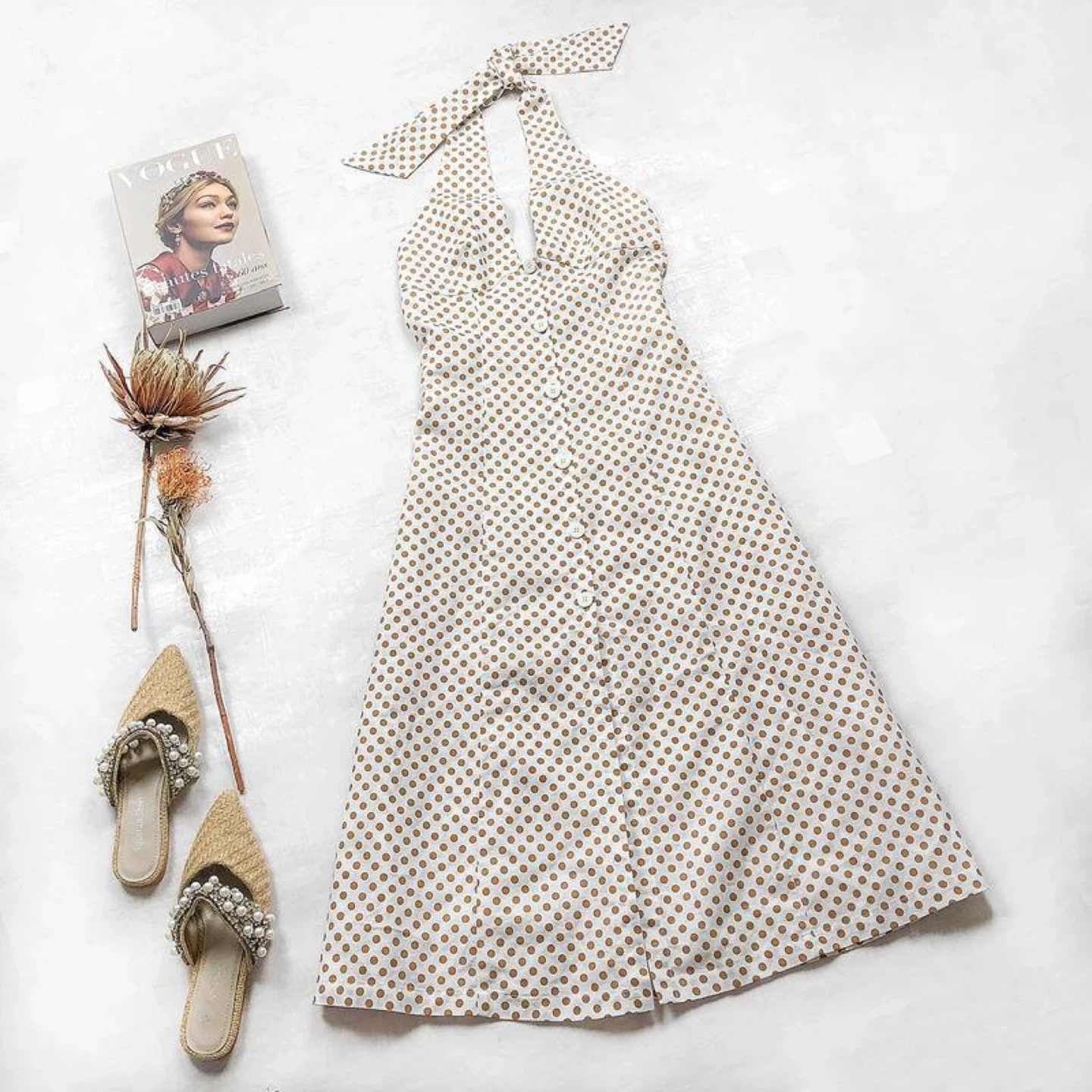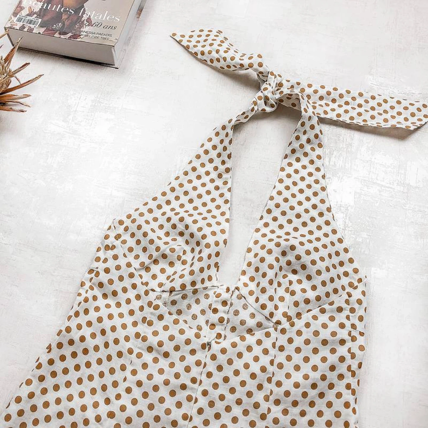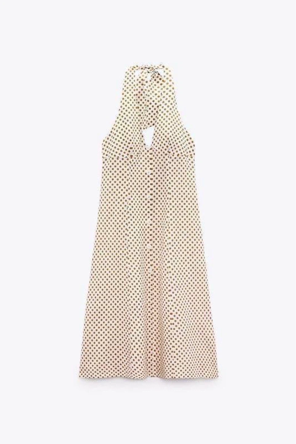 Elegant cream midi dress with brown polka dots that add a vintage charm and light summer elegance. Features a deep neckline with a tie at the neck and an open back, with no zipper or closure.