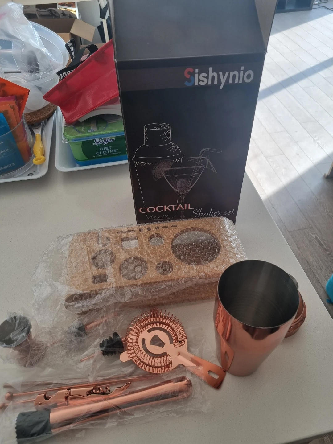 This Sishynio cocktail shaker set comes in a copper finish. It includes a shaker, strainer, jigger, and other bar tools. A wooden stand is also included for organized storage.