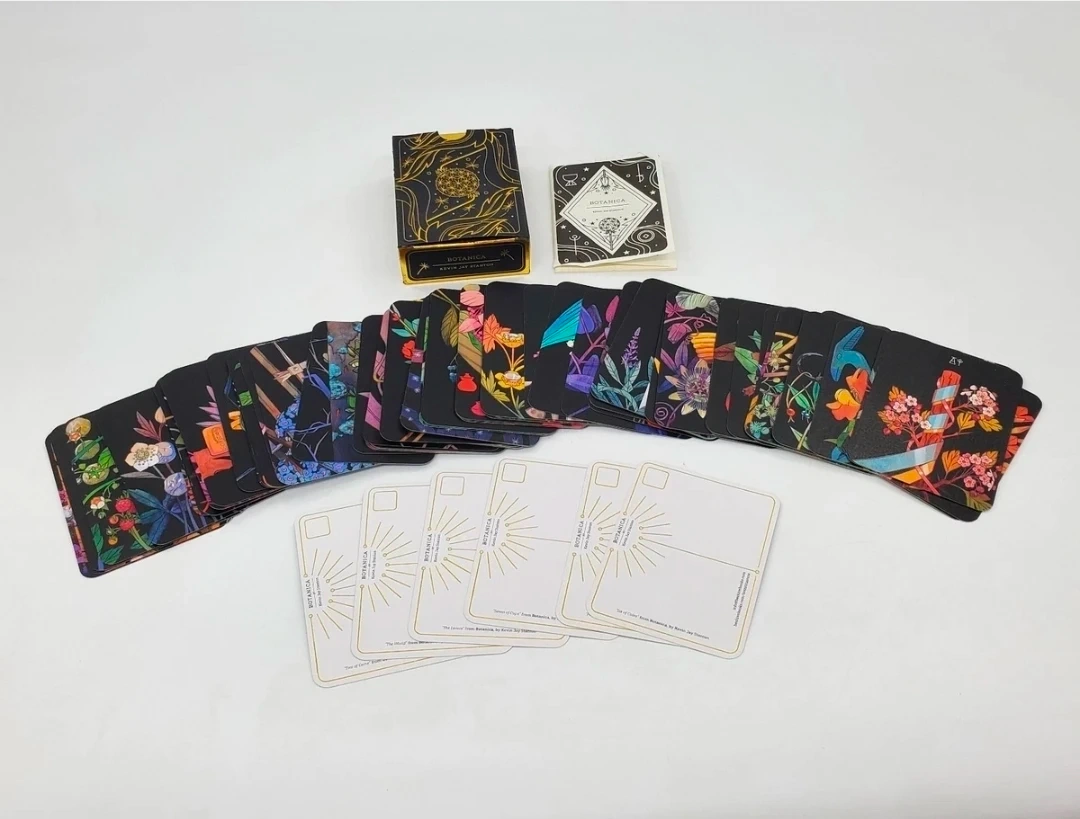 The Botanica Tarot Card Deck by Kevin Jay Stanton features 78 cards that explore the language of flowers through intricate designs and meaningful messages. This deck serves as a tool for divination and self-discovery, allowing users to connect with the natural world and uncover hidden insights. With stunning illustrations and a focus on botany and symbolism, this deck offers a unique and beautiful way to navigate the realm of tarot readings. New, open box, not used.