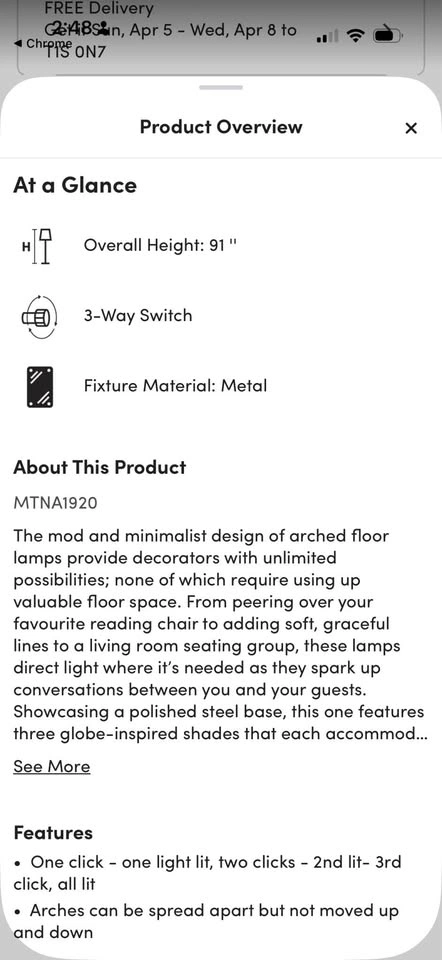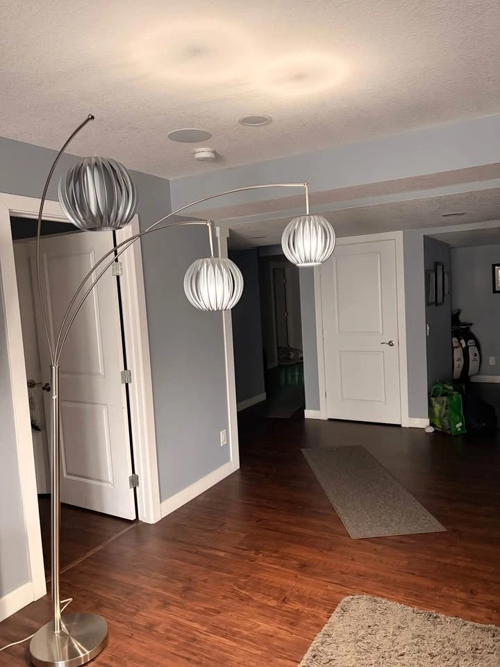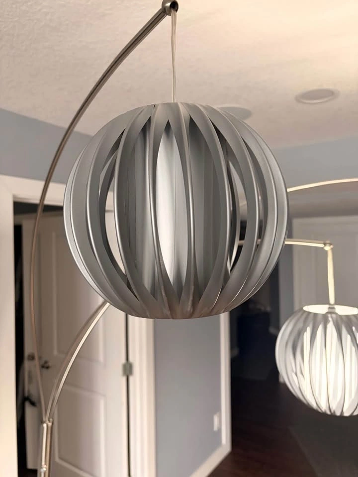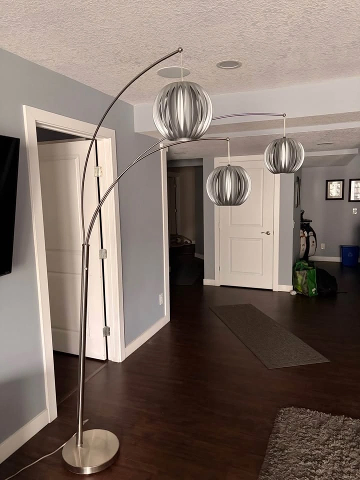 Stylish floor lamp with a brushed silver metal finish and three arched arms. Each arm holds a round pleated fabric shade that provides soft, diffused light. The sturdy circular base keeps the tall frame stable. Individual lights can be positioned to adjust the spread of light.