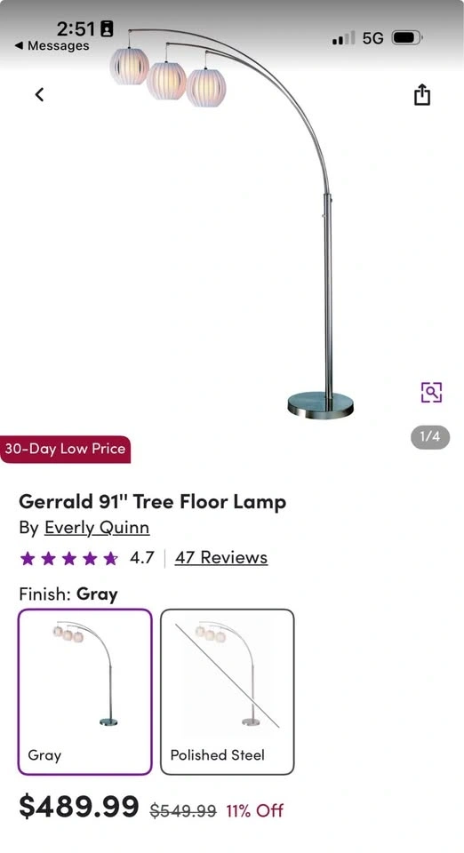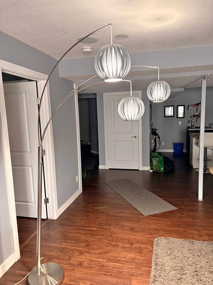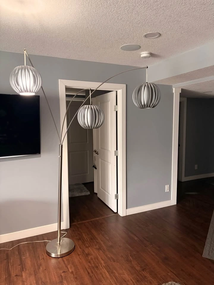 Stylish floor lamp with a brushed silver metal finish and three arched arms. Each arm holds a round pleated fabric shade that provides soft, diffused light. The sturdy circular base keeps the tall frame stable. Individual lights can be positioned to adjust the spread of light.