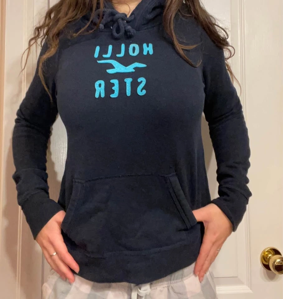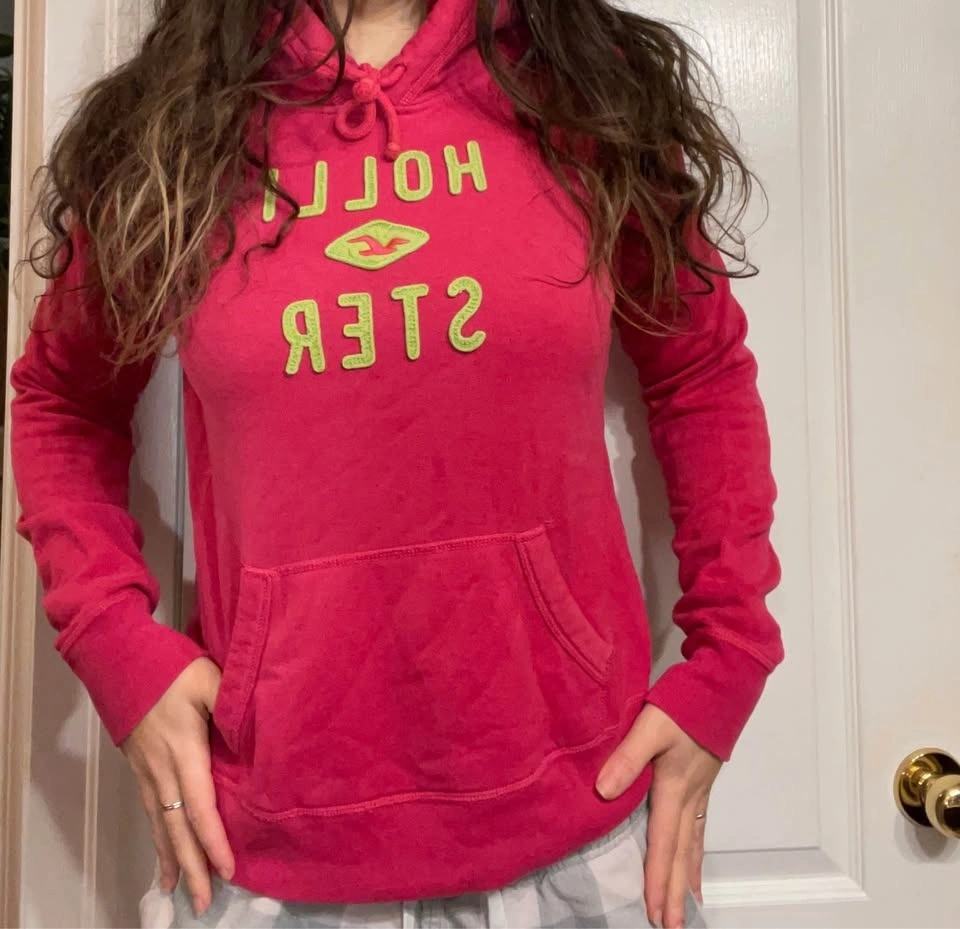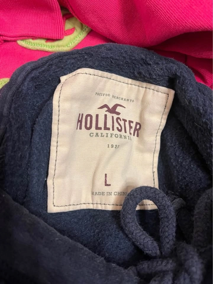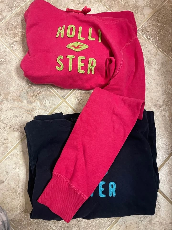 Selling two vintage Hollister hoodies, one pink and one dark blue. Both are size Large but fit more like a Small. Selling for $15 each, or $25 if you buy both.