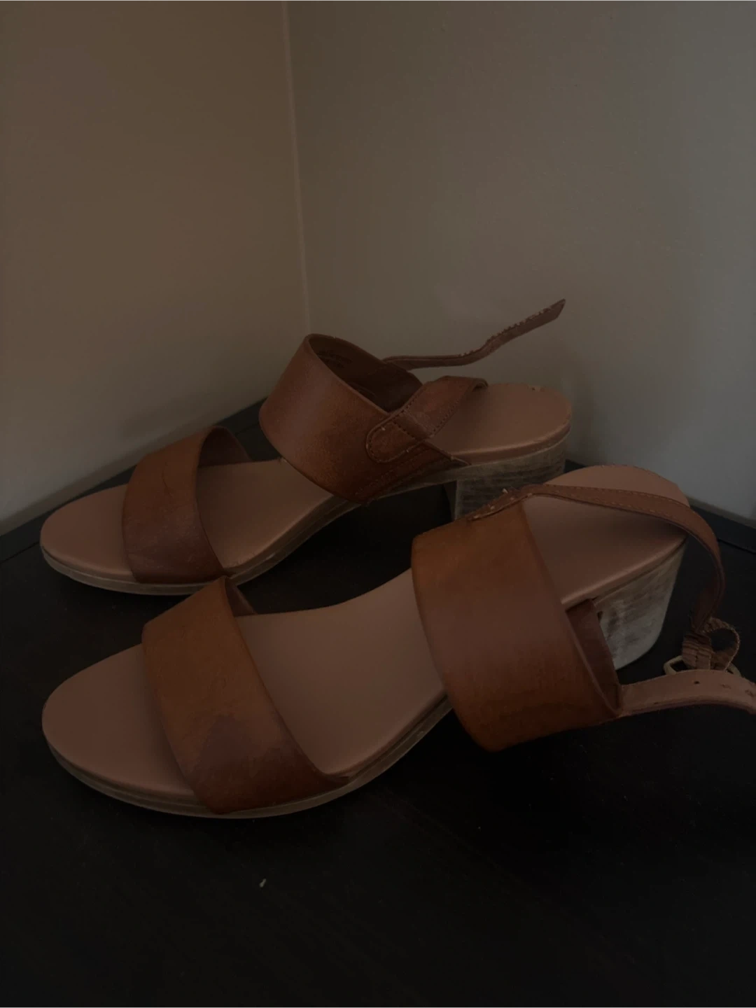These are a pair of brown sandals with a block heel. They have a strap across the toes and an ankle strap. They're in good condition and ready for a new home!