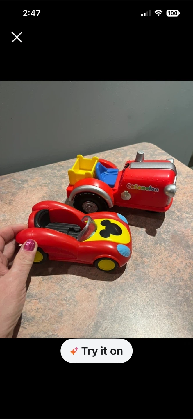 This Cocomelon toy set includes a red race car and a red truck with yellow and blue accents. It's made of plastic. The race car has a Mickey Mouse-like design on the hood. This toy is great for little ones who love vehicles and Cocomelon!