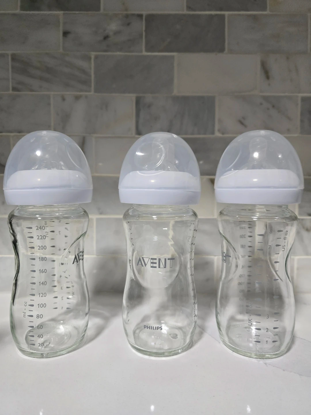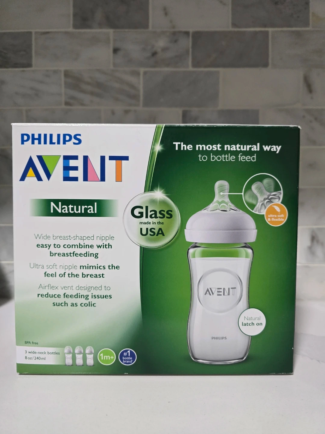 Three Philips Avent Natural glass baby bottles are included. They are designed for a natural latch on and have an ultra soft, flexible nipple. The bottles are BPA free and made in the USA. This is a 3-pack of 8 oz/240 ml bottles.