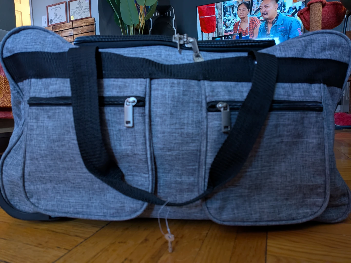 This is a grey duffle bag. It's made of fabric and has a zip closure. It includes a shoulder strap for easy carrying. This bag is great for weekend trips or gym sessions!