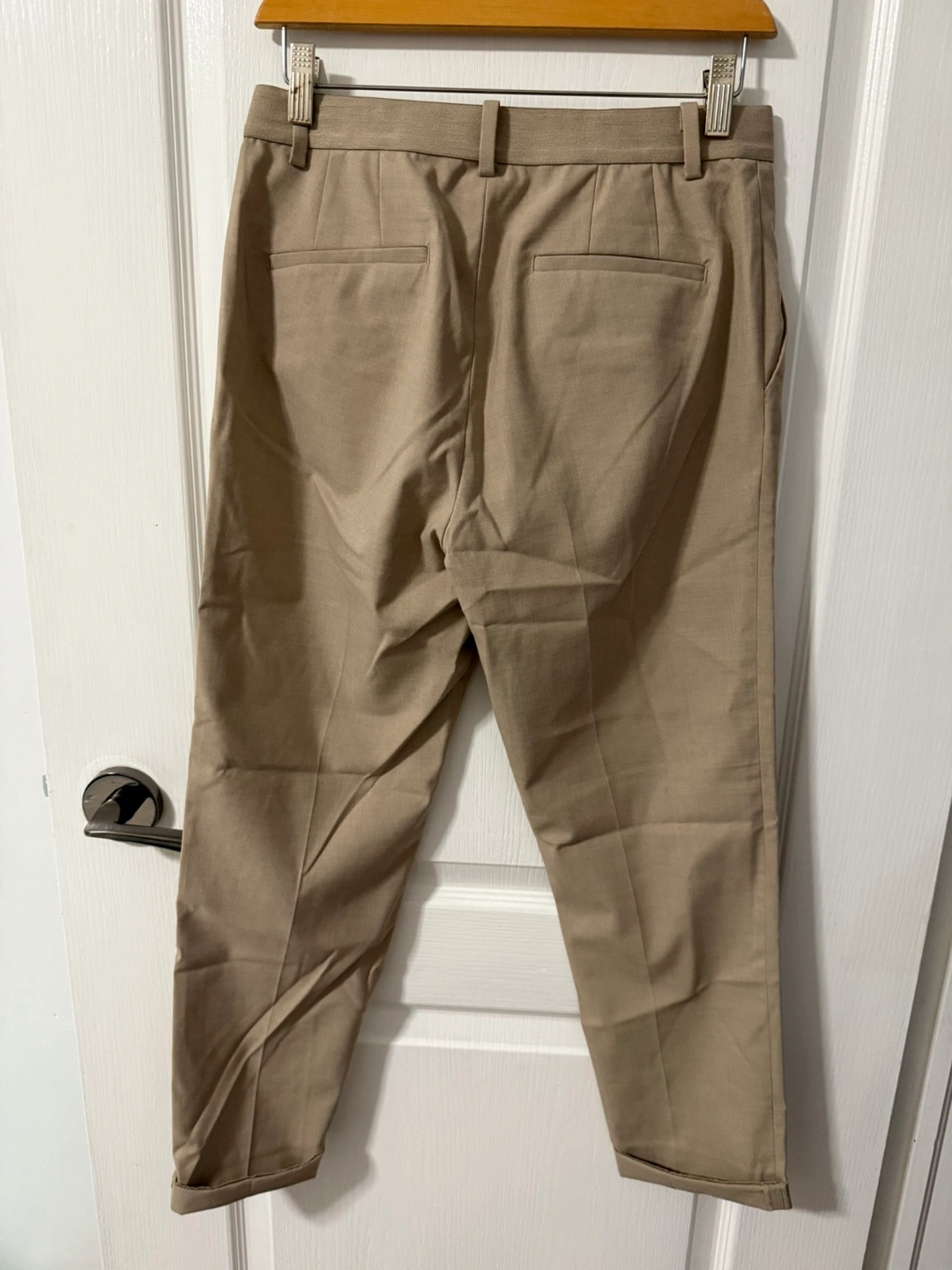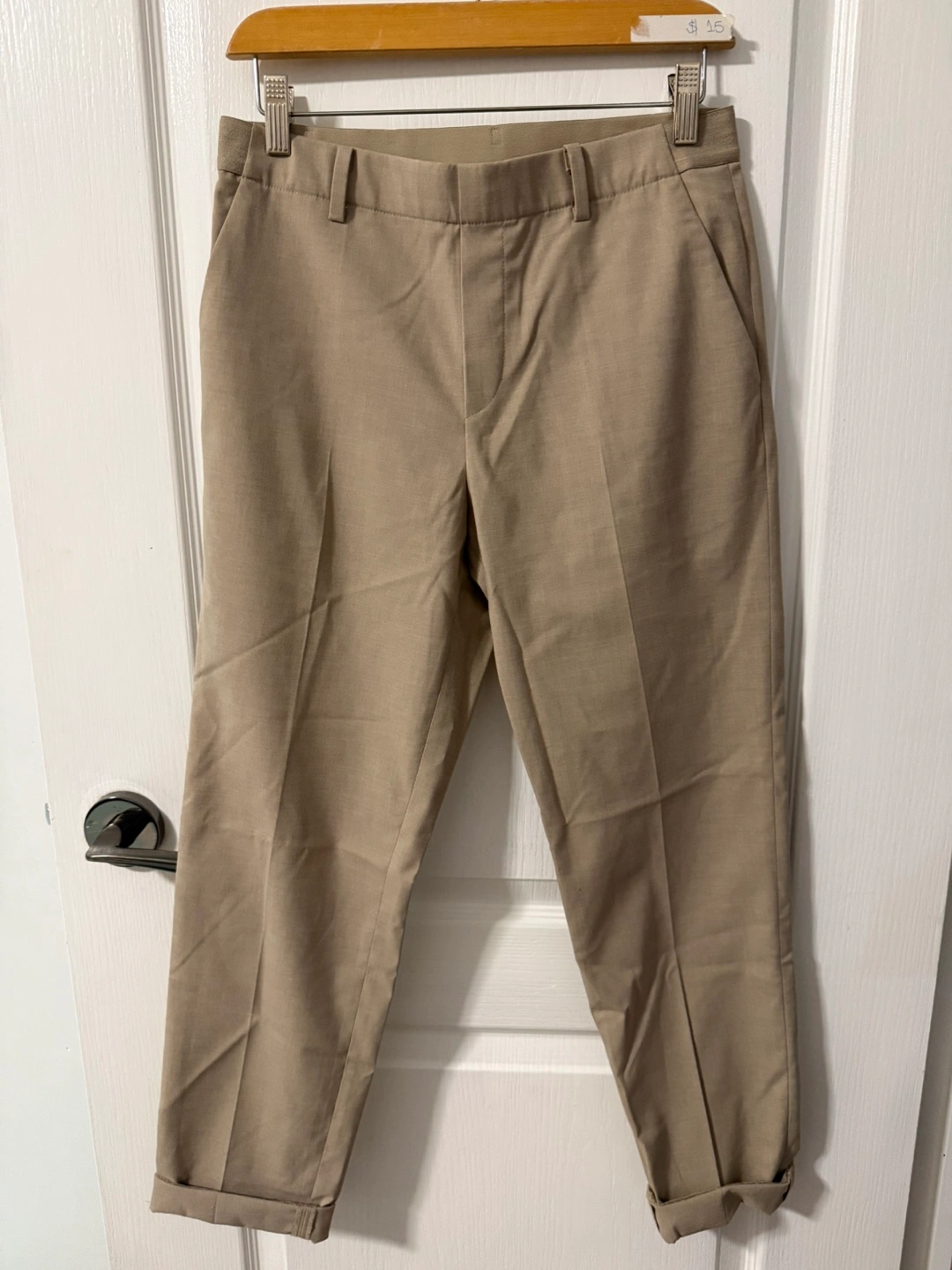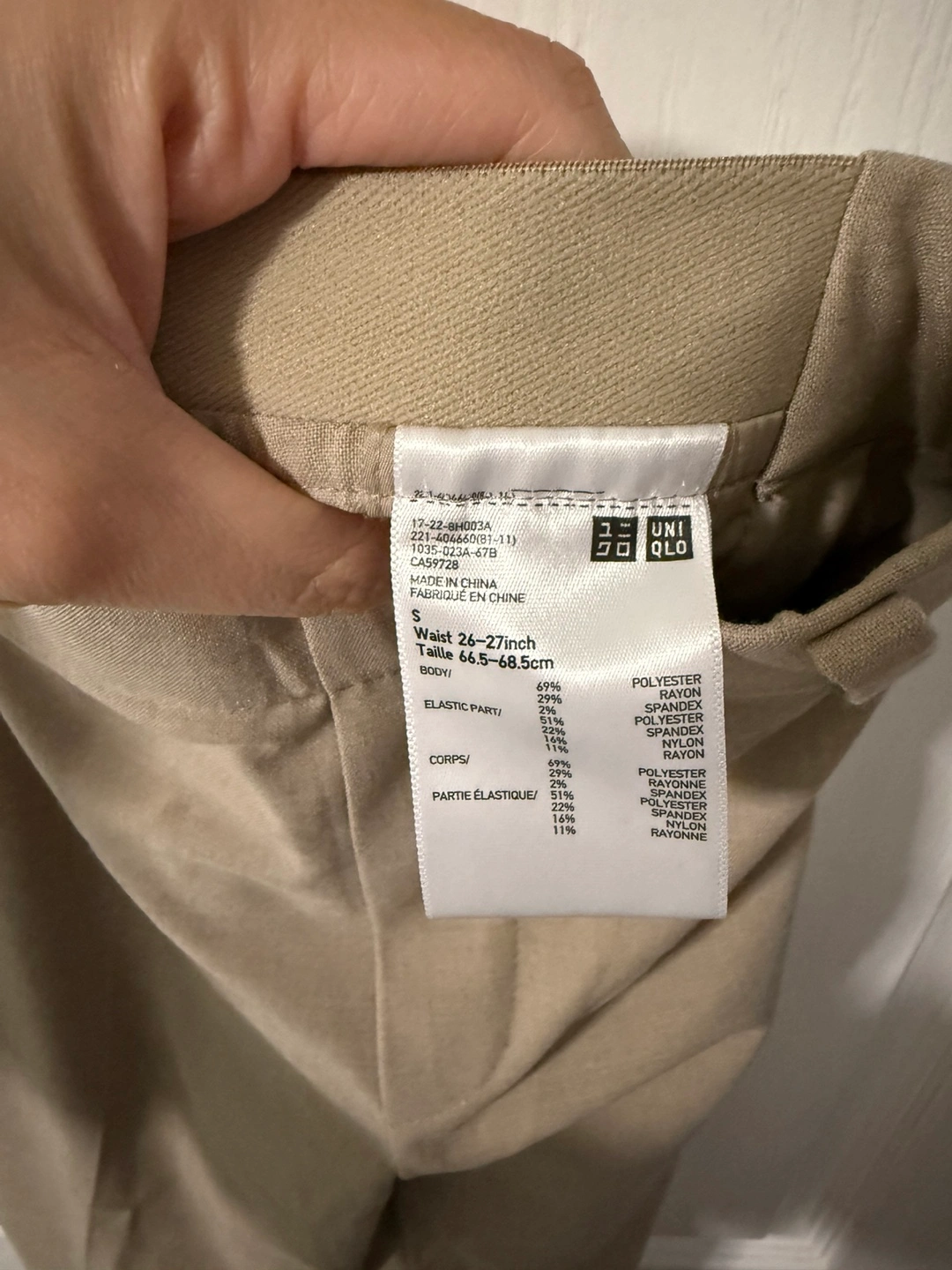 These are a pair of Uniqlo cropped pants in a neutral beige colour. They are a size small with a waist of 26-27 inches. The material is a blend of polyester, rayon, spandex, and nylon. Perfect for a casual and comfortable look!