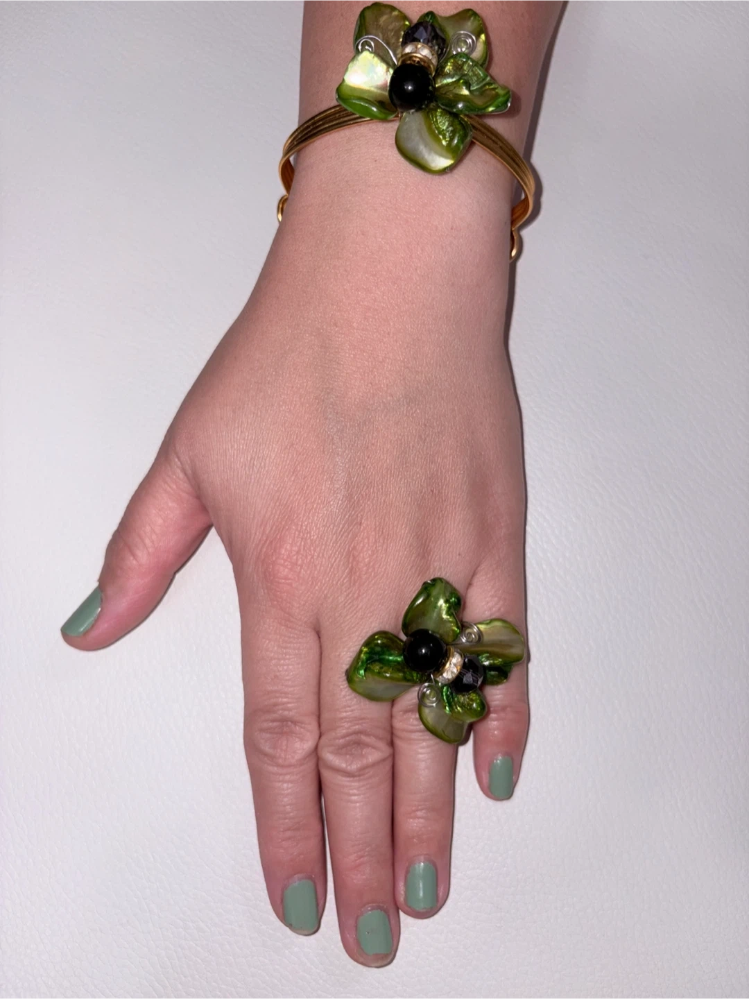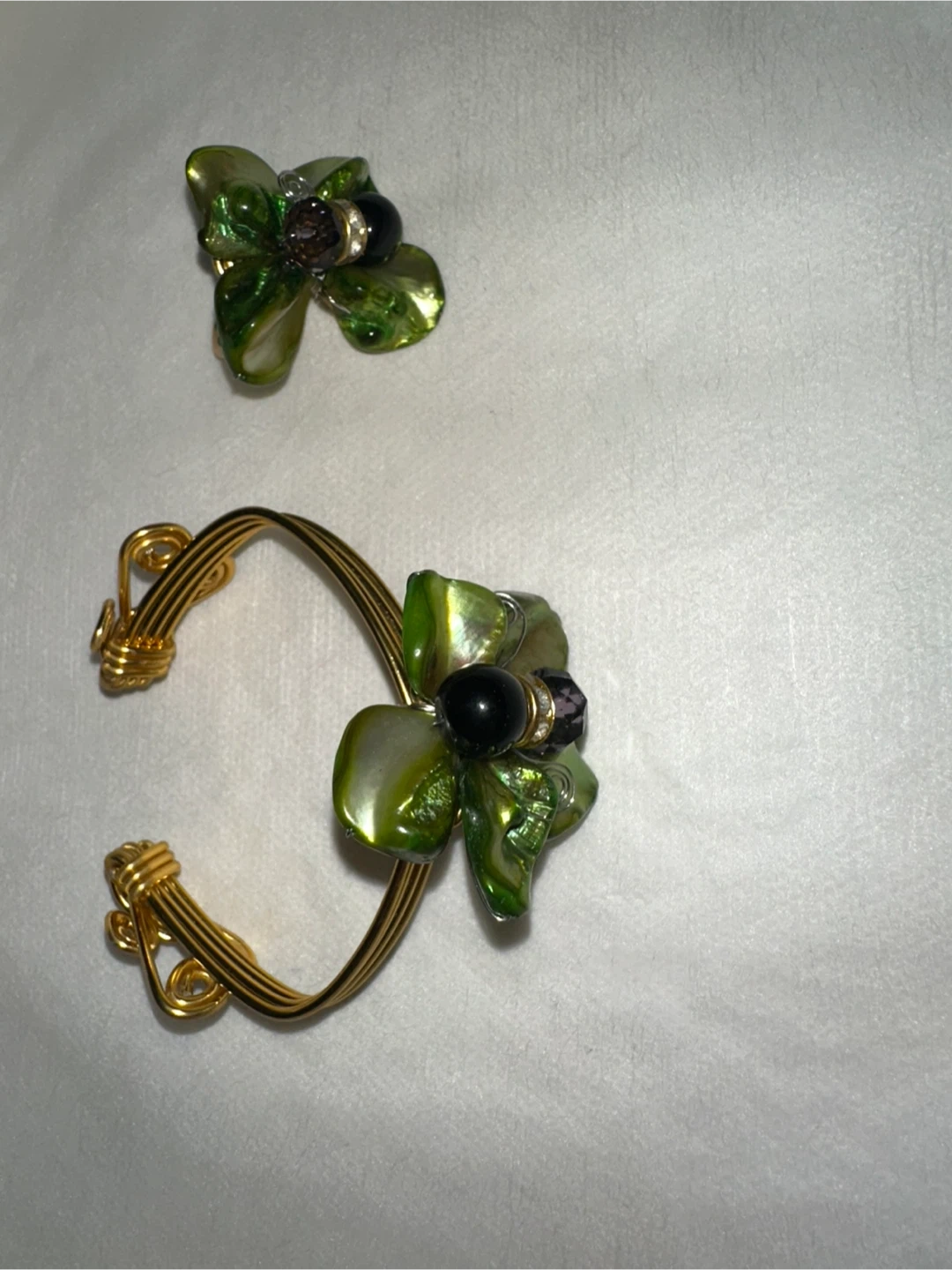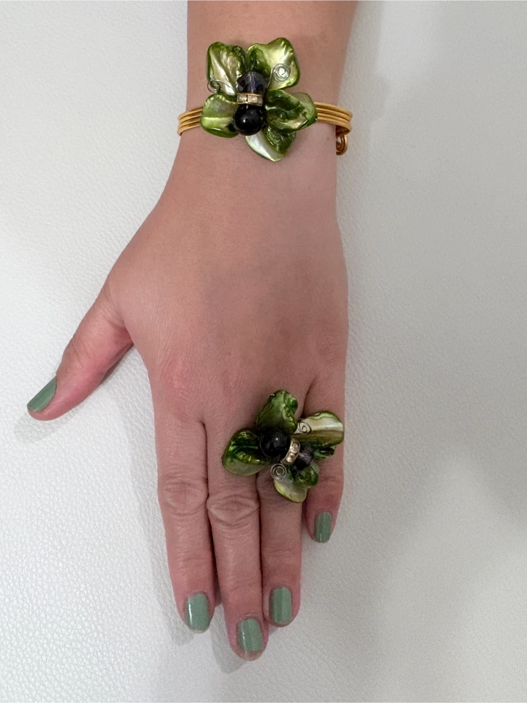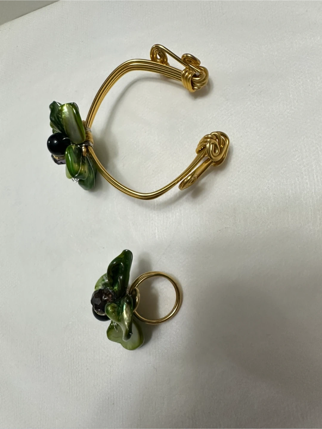 Here's a lovely matching bracelet and ring set! The gold-tone metal is adorned with green floral accents and small black beads. Perfect for adding a touch of nature-inspired elegance to your look