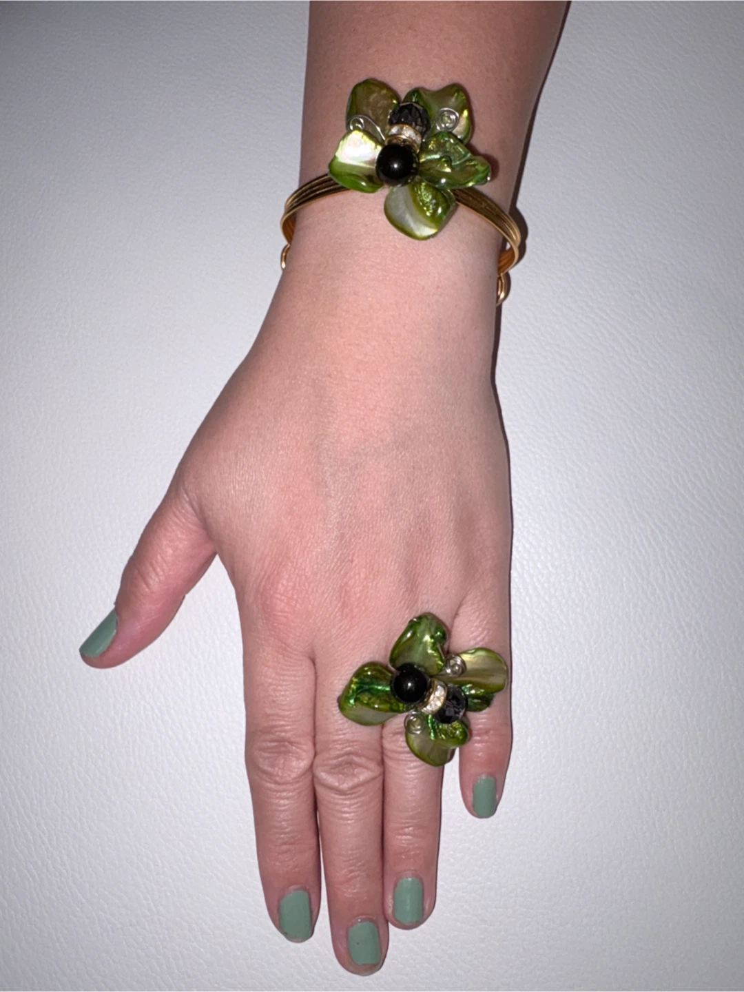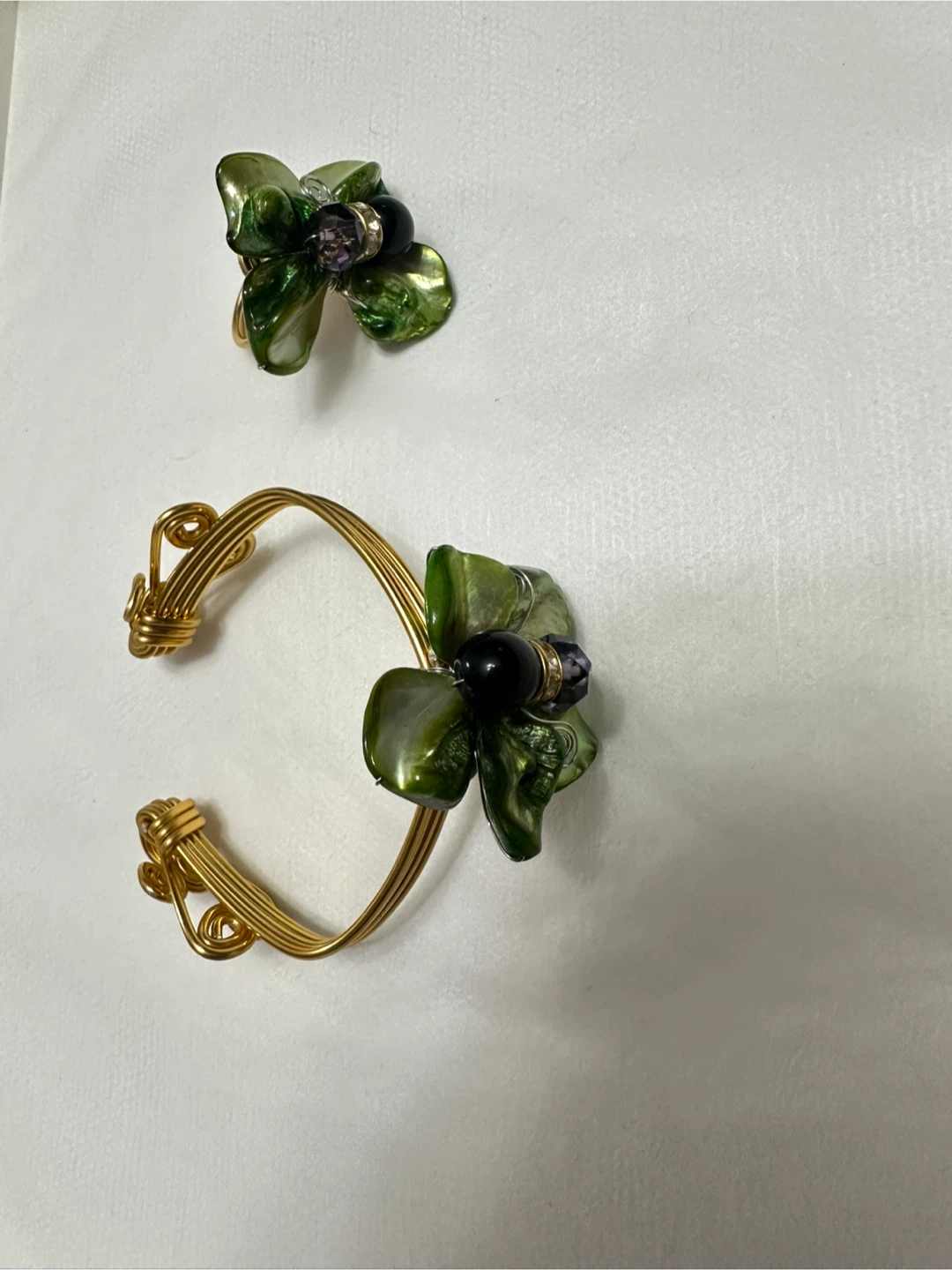 Here's a lovely matching bracelet and ring set! The gold-tone metal is adorned with green floral accents and small black beads. Perfect for adding a touch of nature-inspired elegance to your look