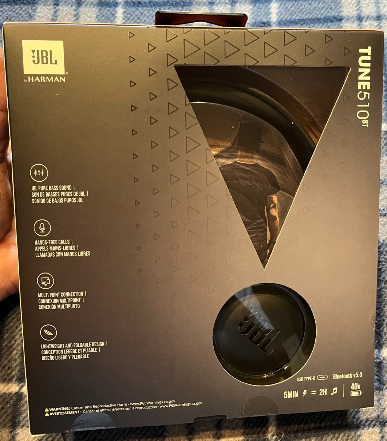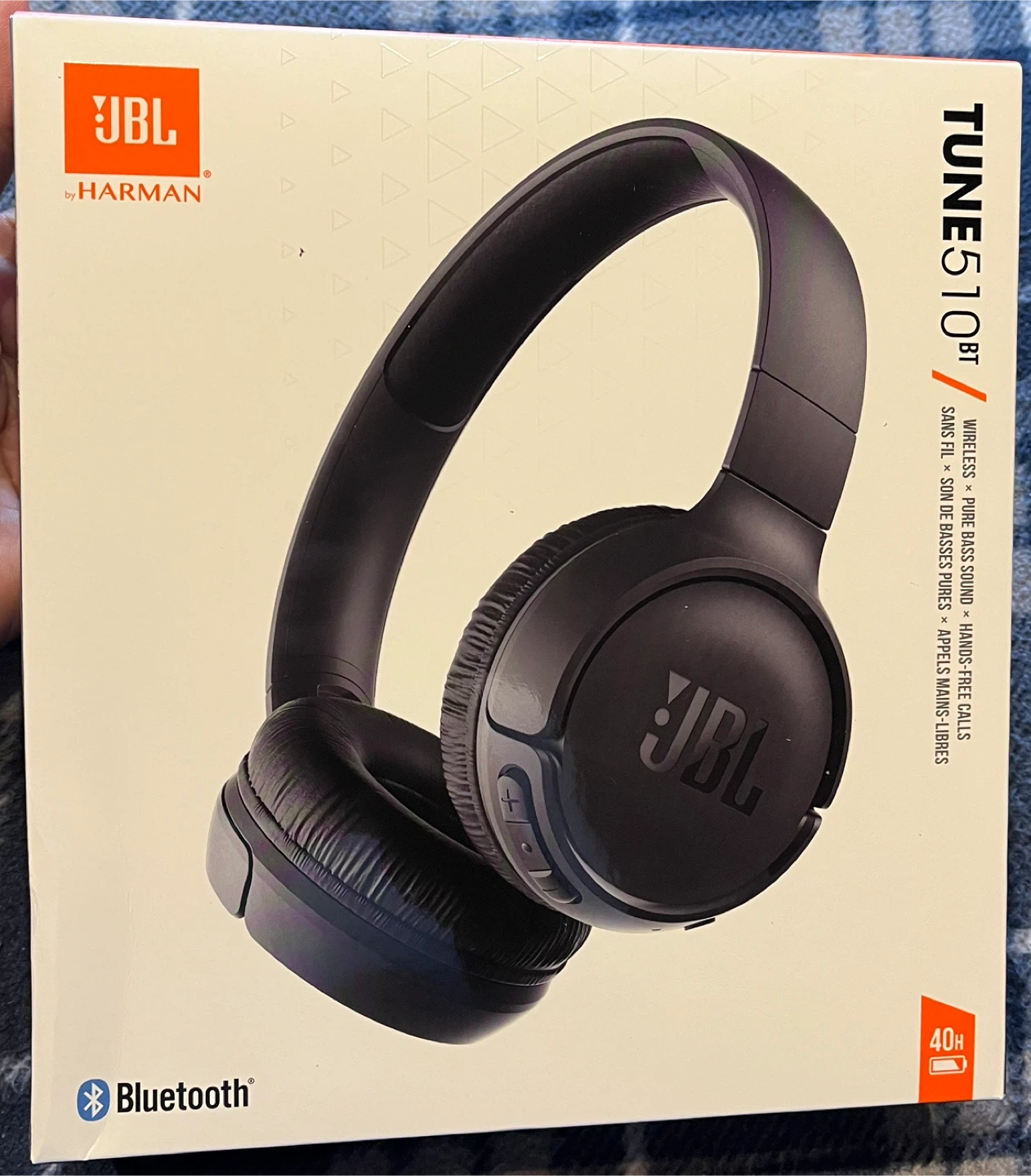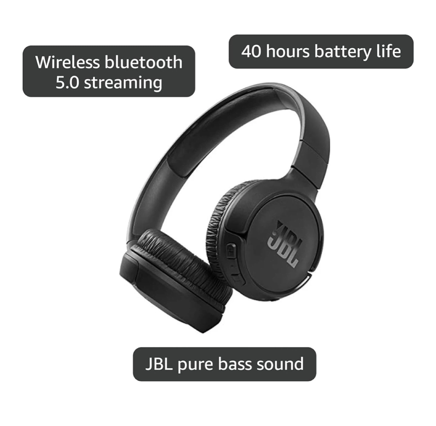 These JBL Tune 510BT headphones offer wireless Bluetooth 5.0 streaming and 40 hours of battery life. They feature JBL pure bass sound and hands-free calls. They're lightweight and have a foldable design.
