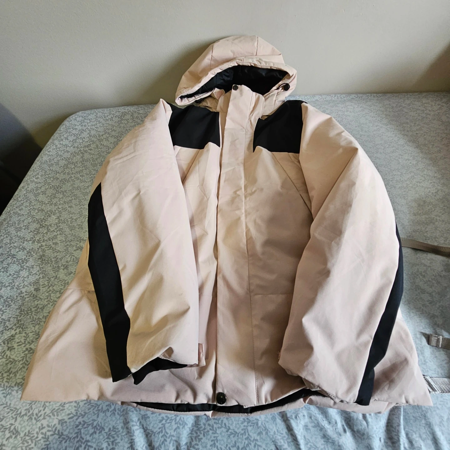 This light pink winter jacket has a hood and black accents. It's designed for warmth and comfort. It looks like it would be great for cold weather activities!