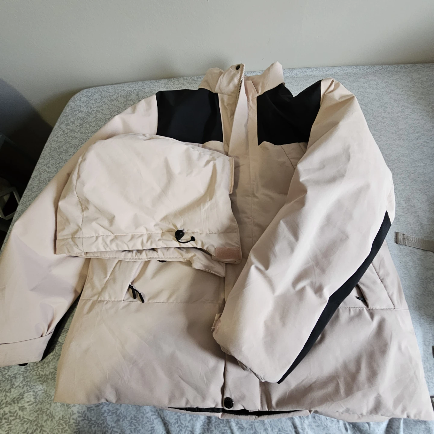 This light pink winter jacket has a hood and black accents. It's designed for warmth and comfort. It looks like it would be great for cold weather activities!