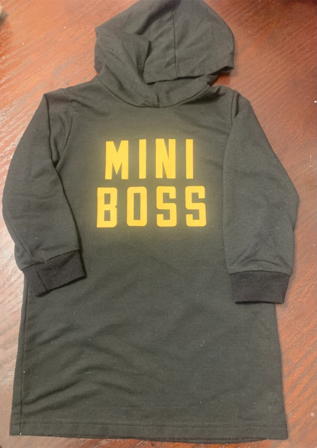 This is a black PatPat hoodie dress for kids. It's sized 3-4 years and features a yellow "Mini Boss" graphic. The dress is made of a soft fabric blend.
