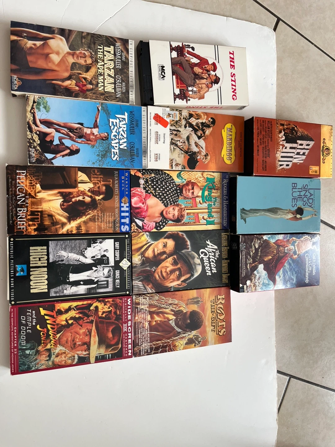Collection of 10 VHS tapes including classic films. Titles range from 'Tarzan the Ape Man' to 'Indiana Jones and the Temple of Doom'. These tapes are perfect for a retro movie night.
