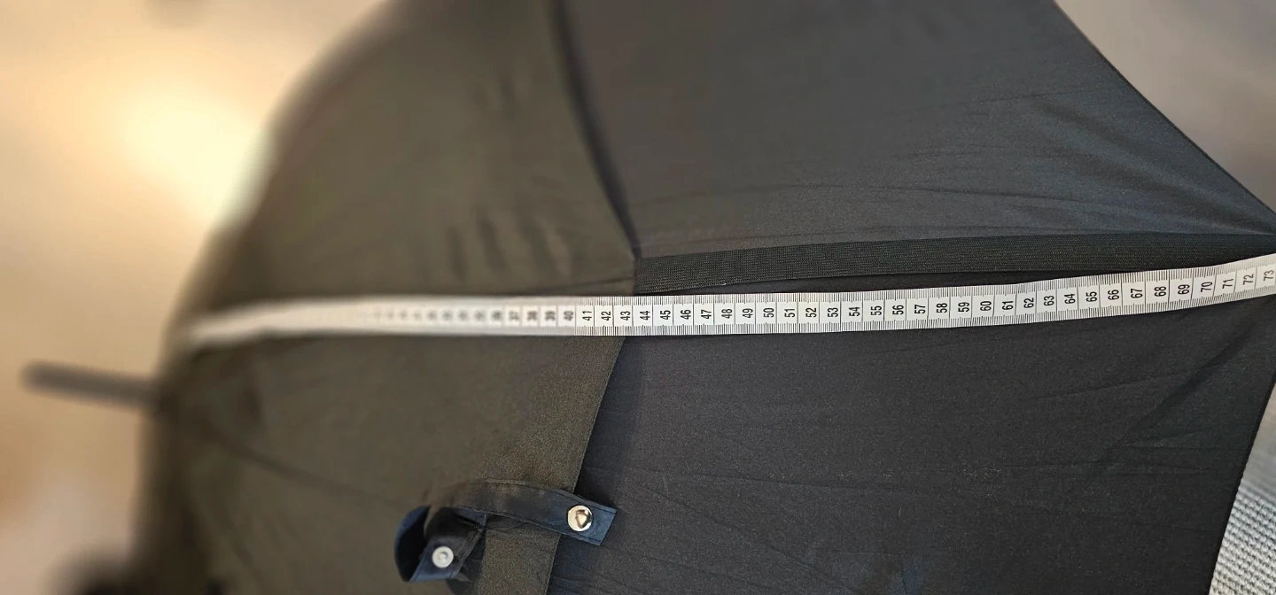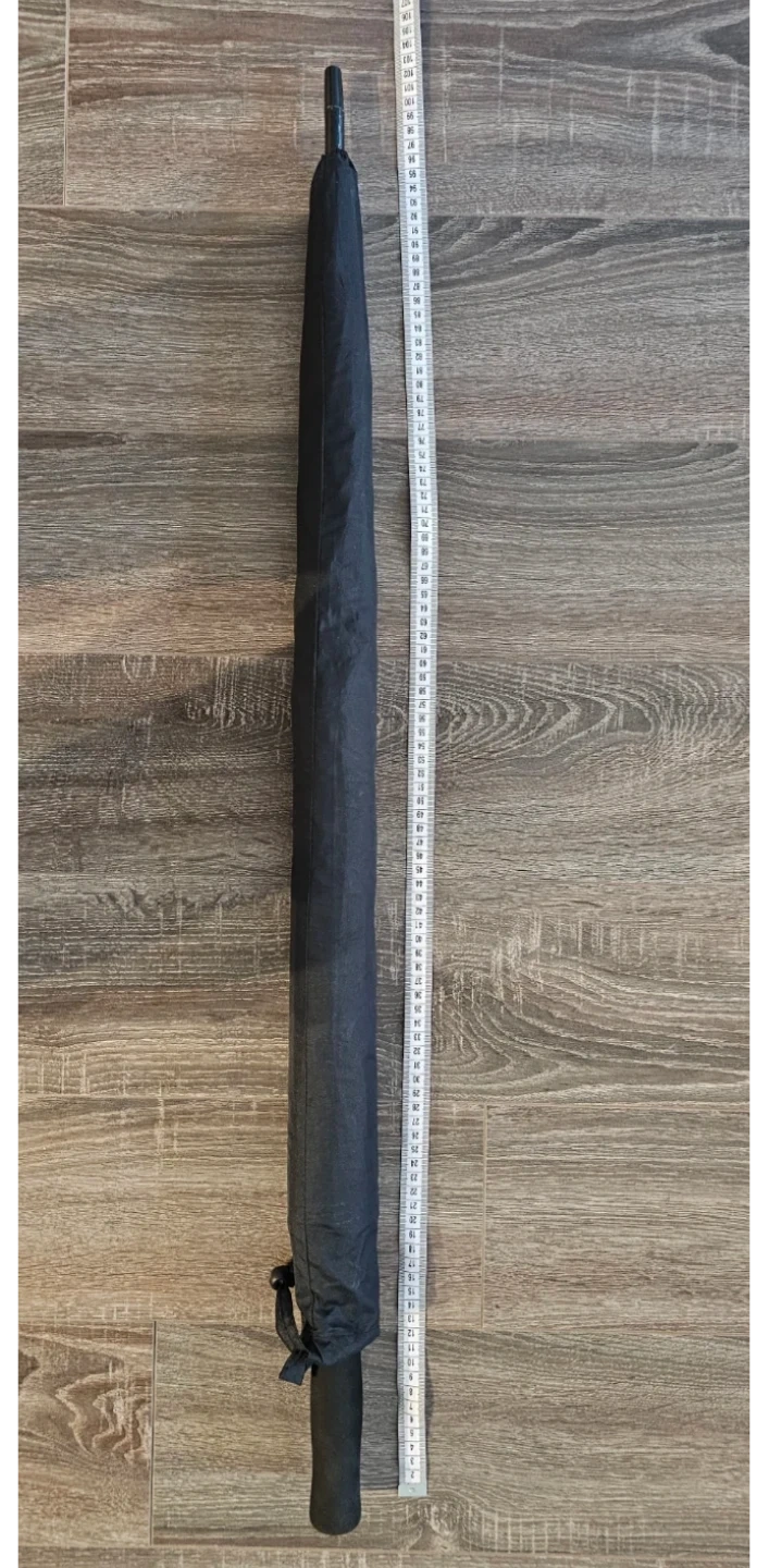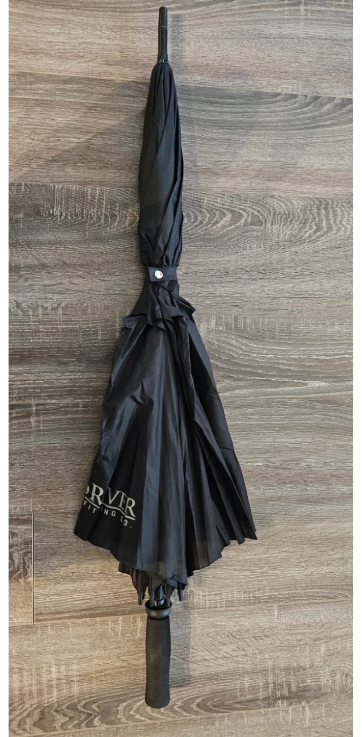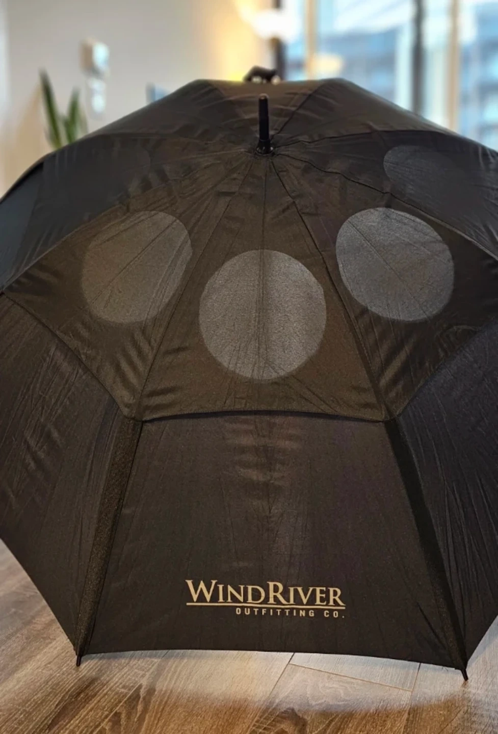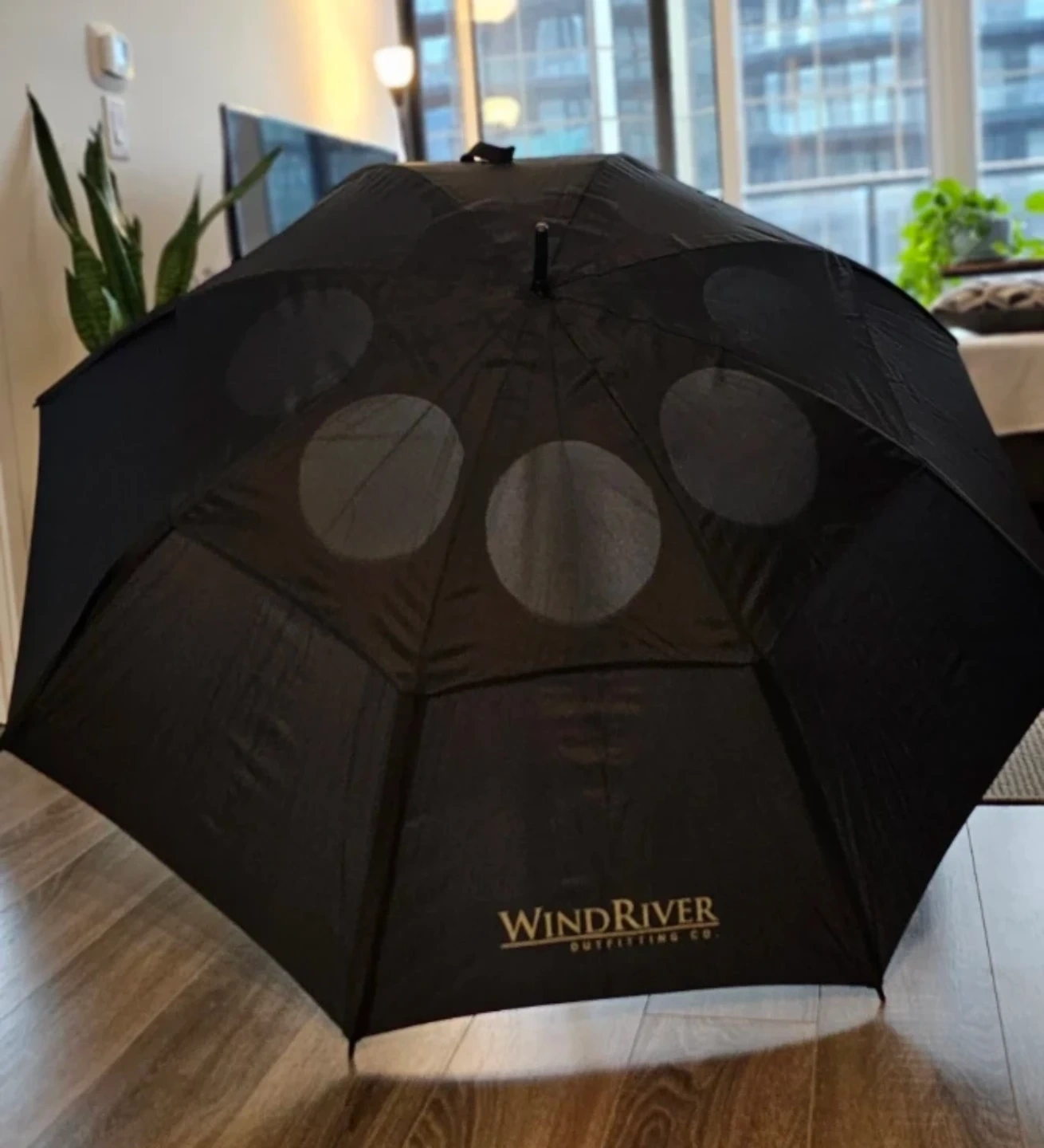 Black umbrella from WindRiver Outfitting Co. Features vented panels for wind resistance. Closed length approximately 104 cm, open diameter 152 cm.