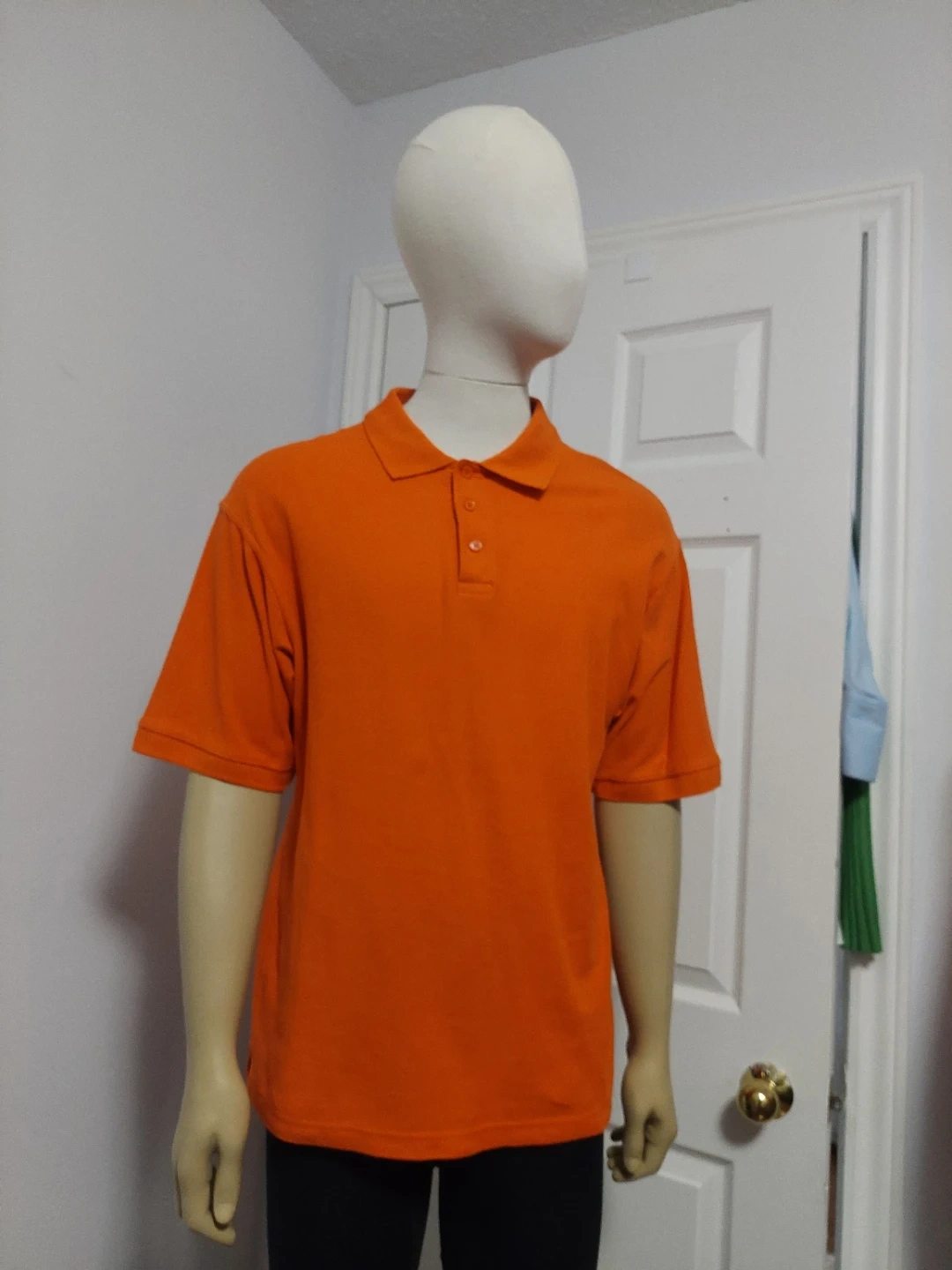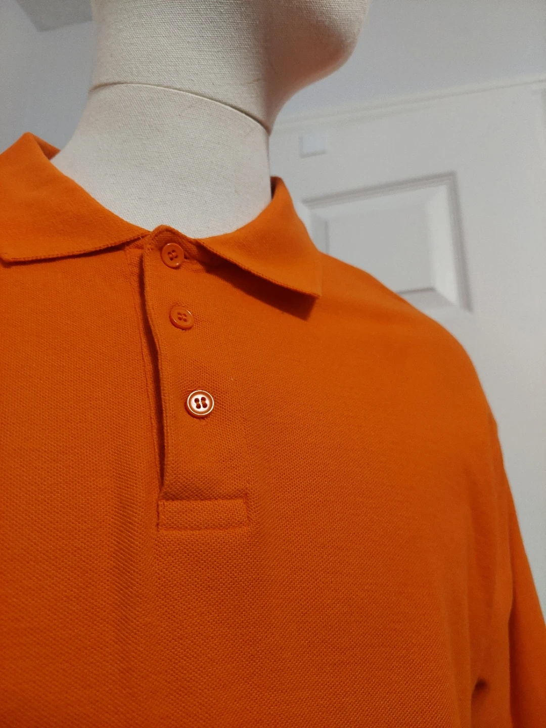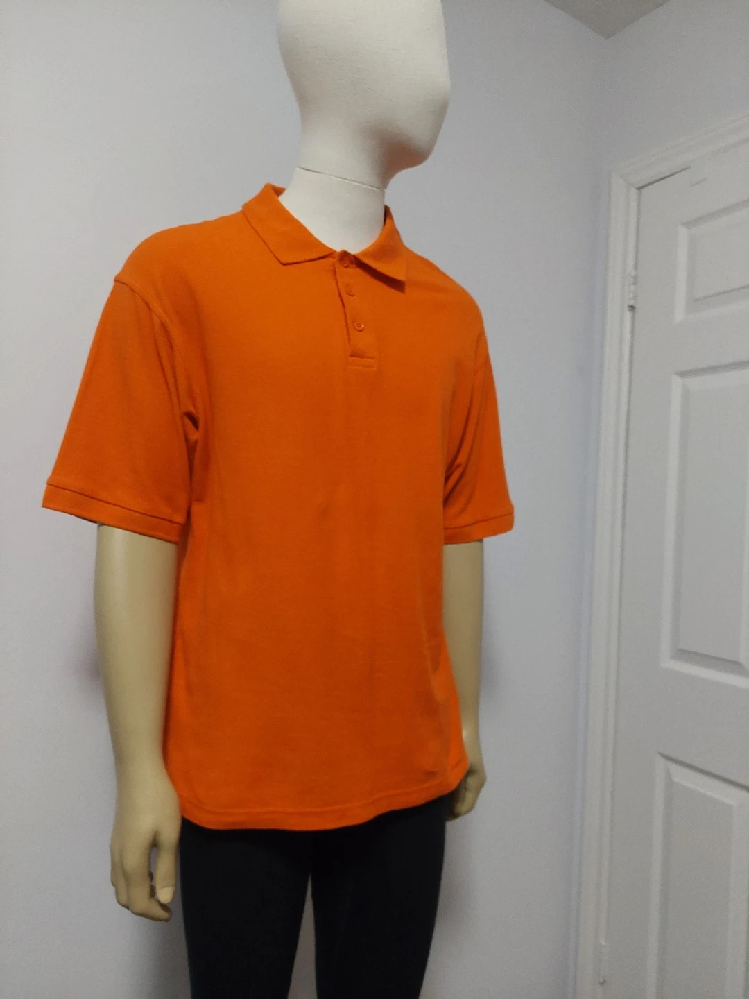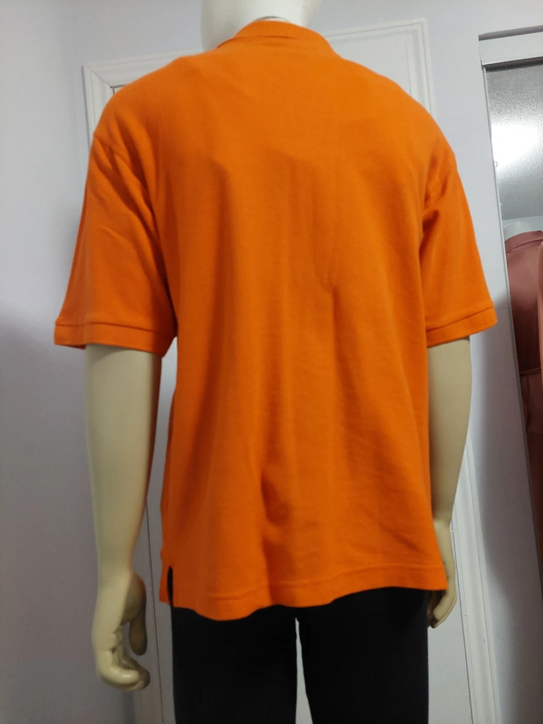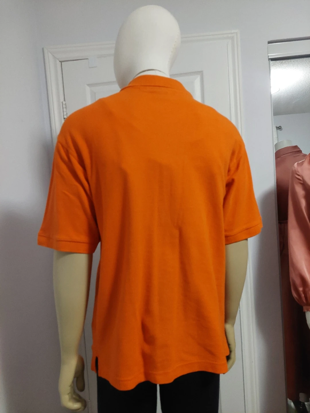 This is an orange short-sleeve polo shirt from MBK SUPRIME. It's a size medium. The material is cotton blend.