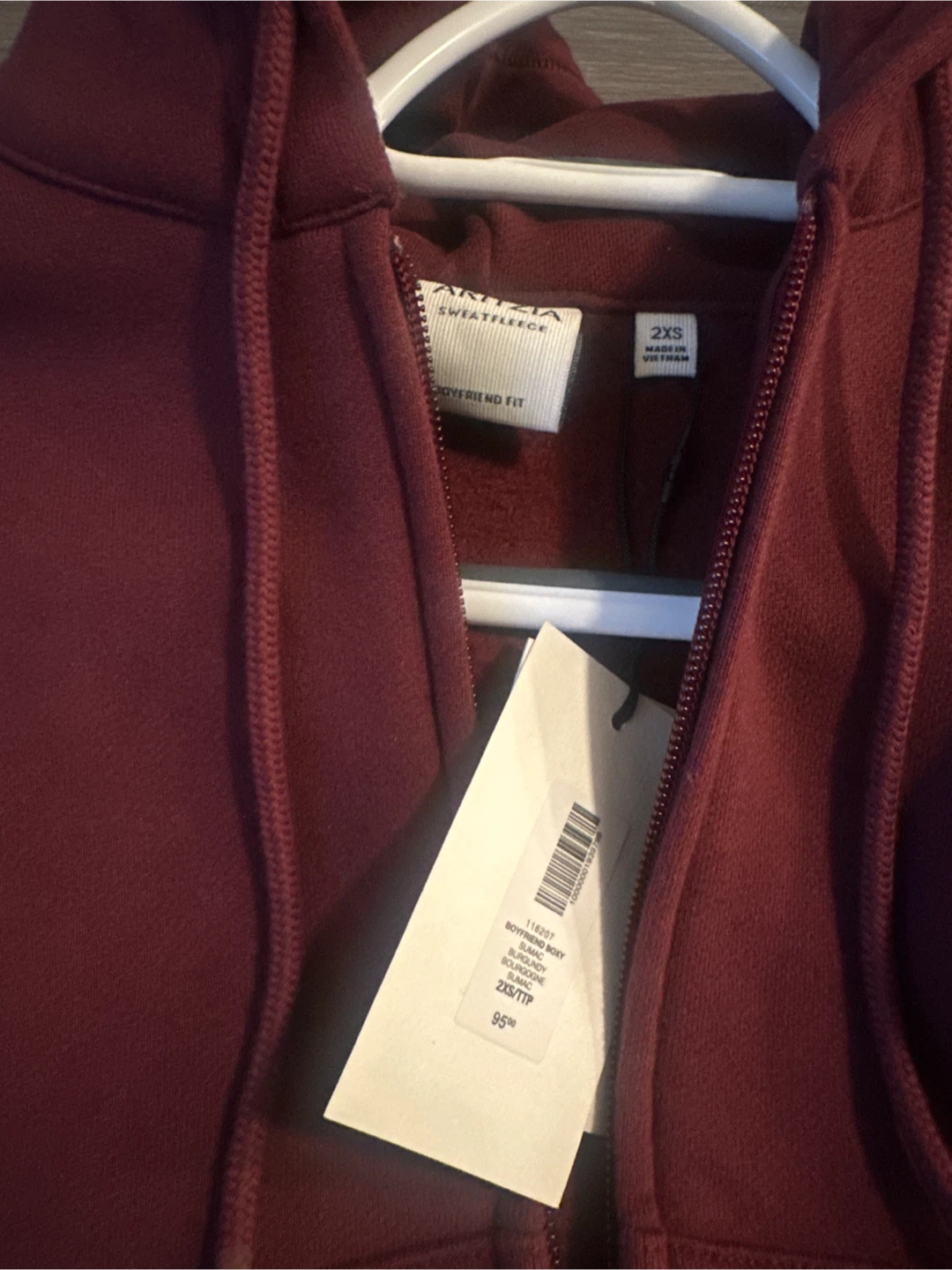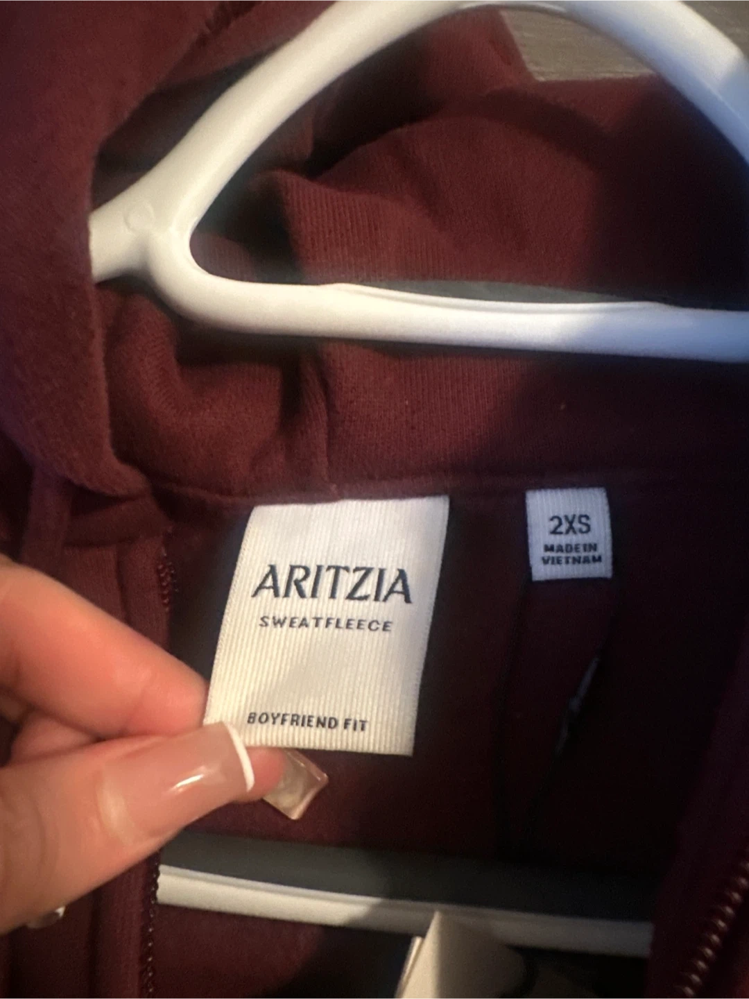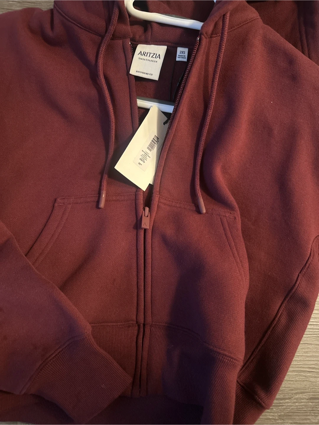 Maroon Aritzia zip-up hoodie. It's a Sweatfleece material with a Boyfriend Fit.