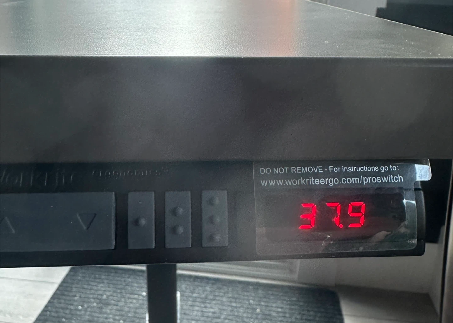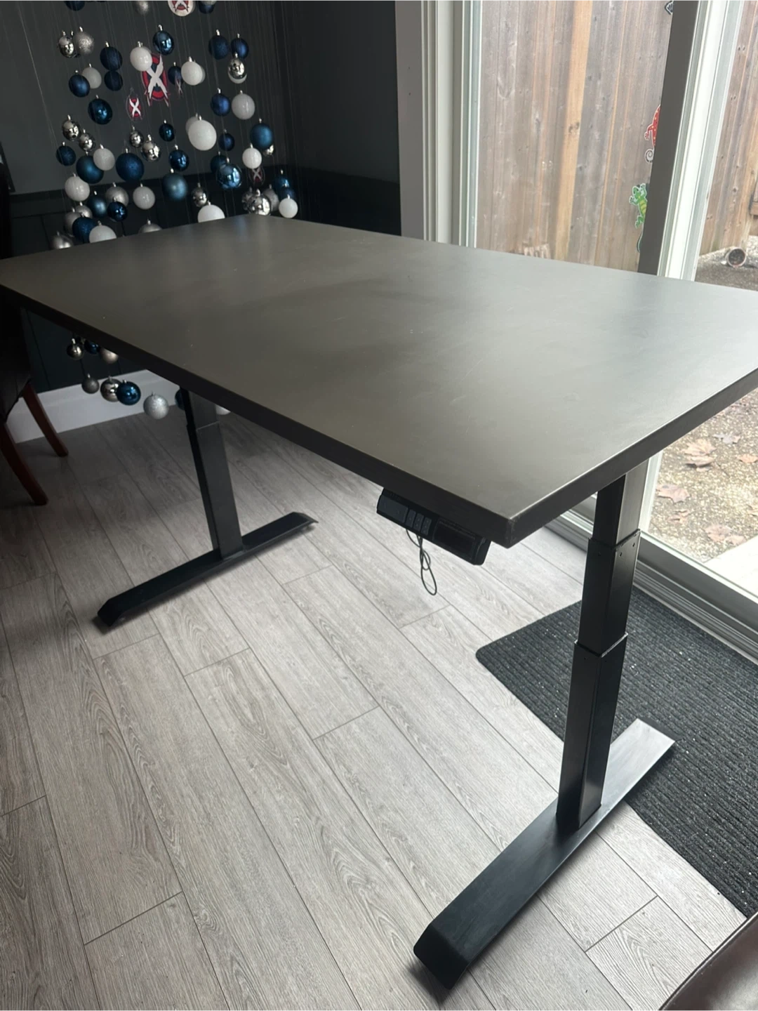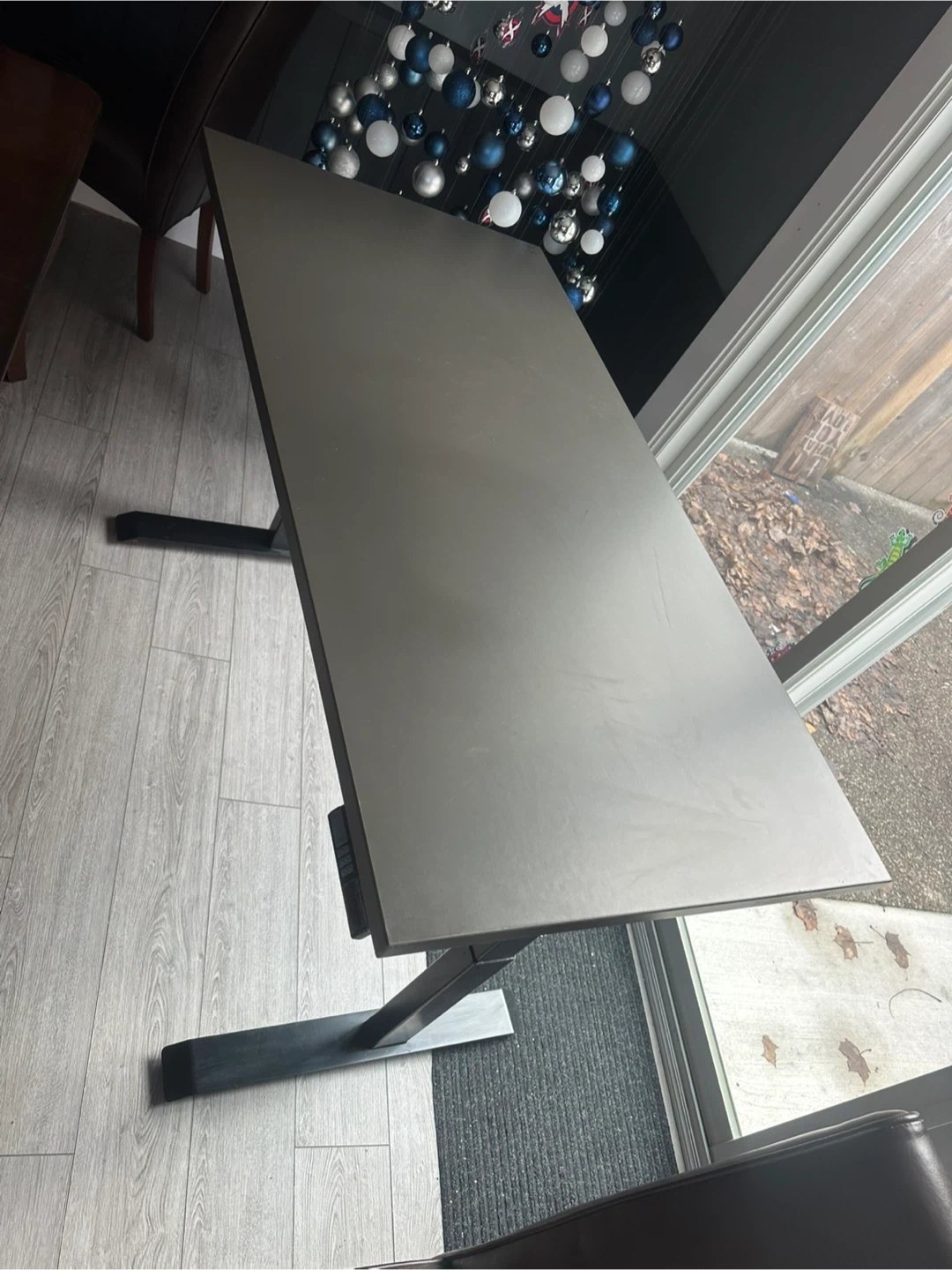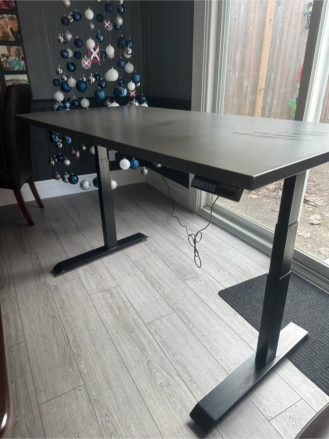 This is a Workrite Ergo Ergoelectric standing desk. It's a grey desktop with black adjustable legs. The control panel has a digital display and up/down buttons. Includes power cord and control unit.