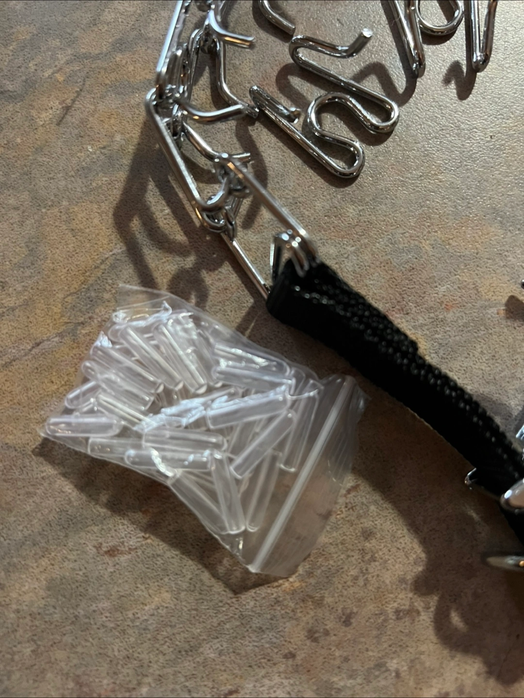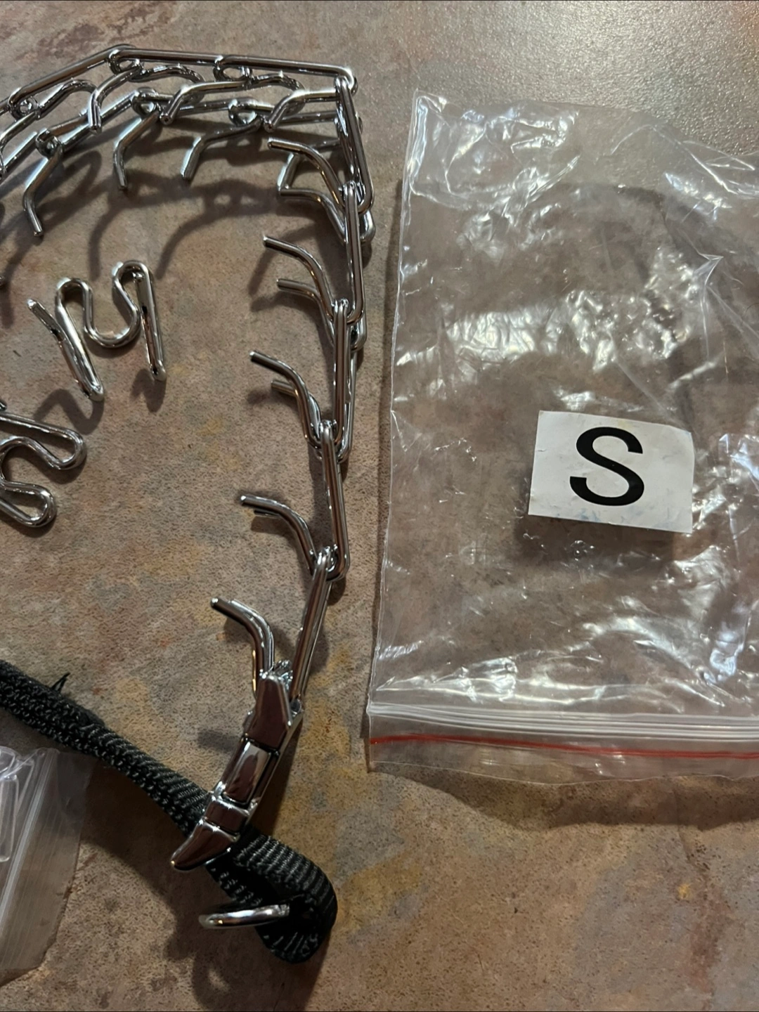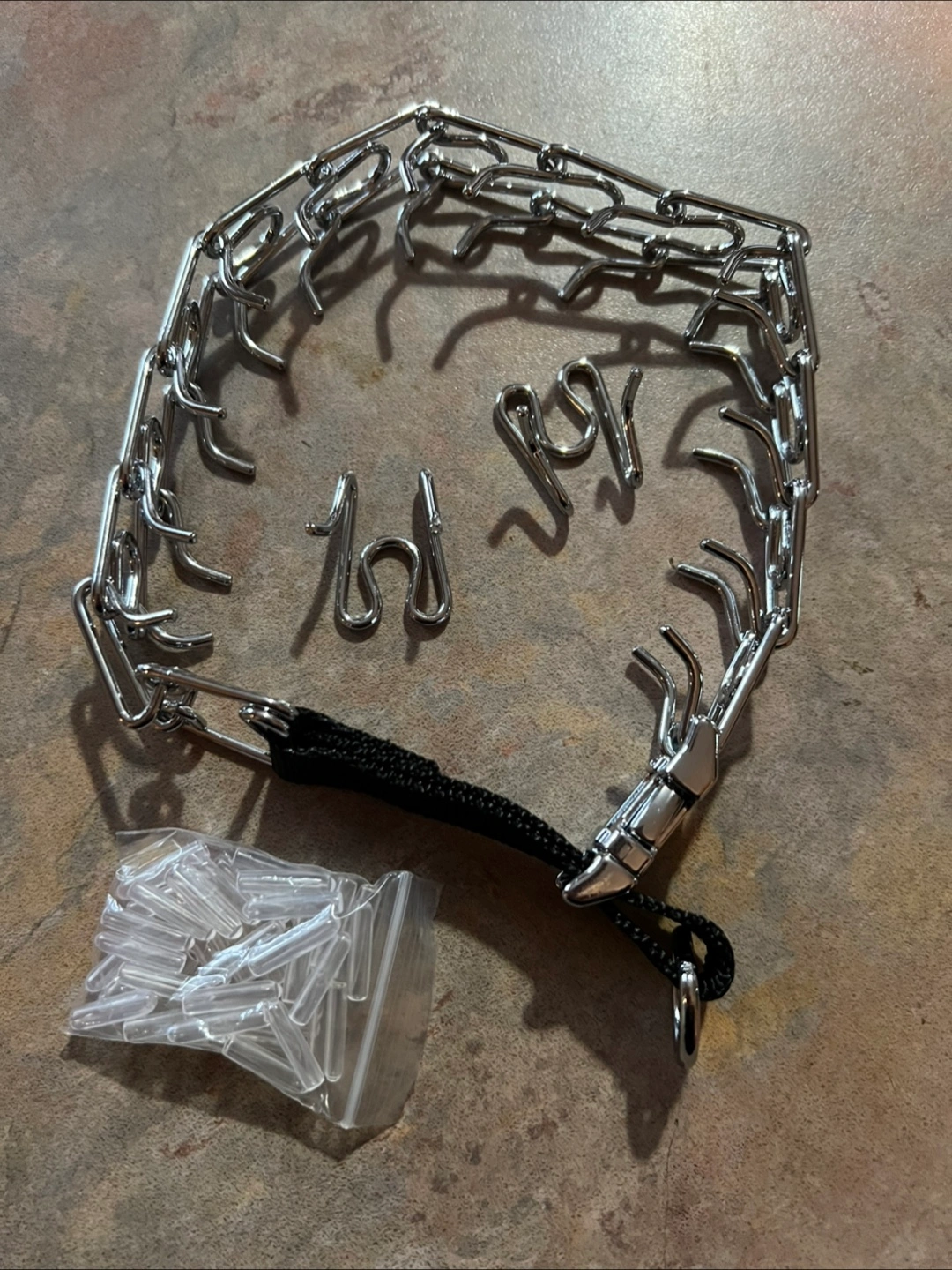 Selling a dog prong training collar in size small. It is new and includes the additional prongs and a black nylon strap. Great for training your furry friend!
