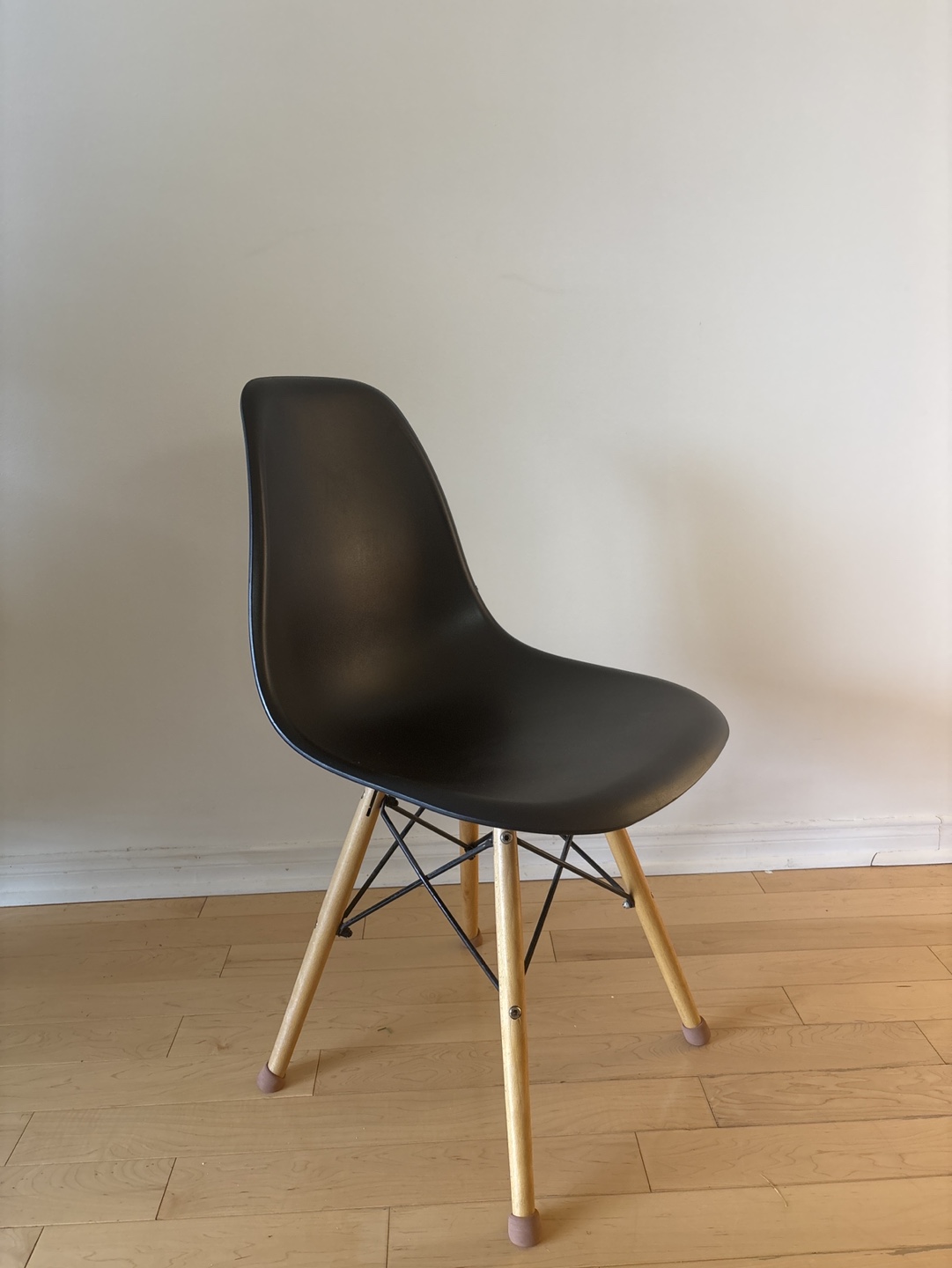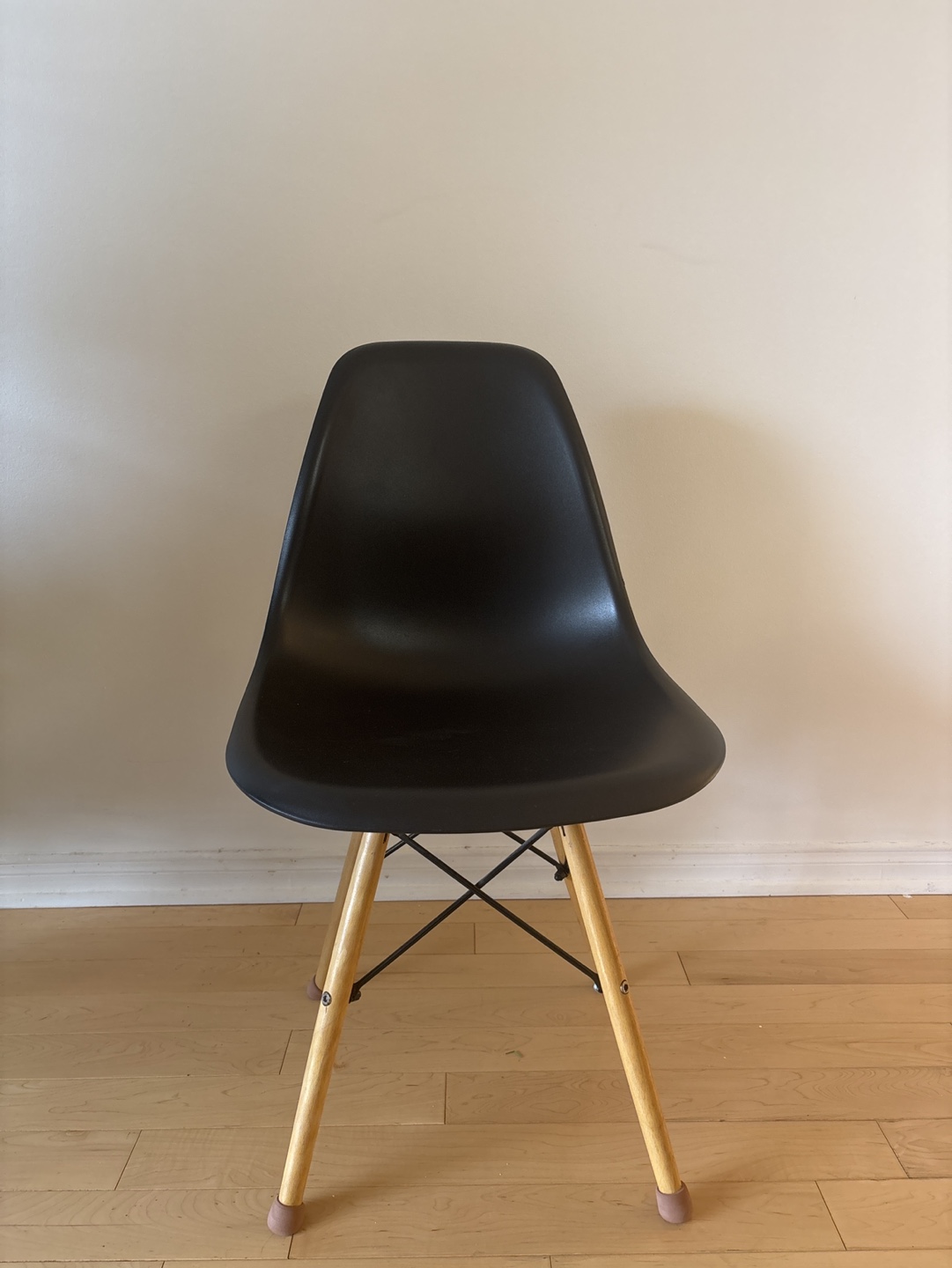 Black plastic chair with wooden legs. Great for a dining room, kitchen or office.