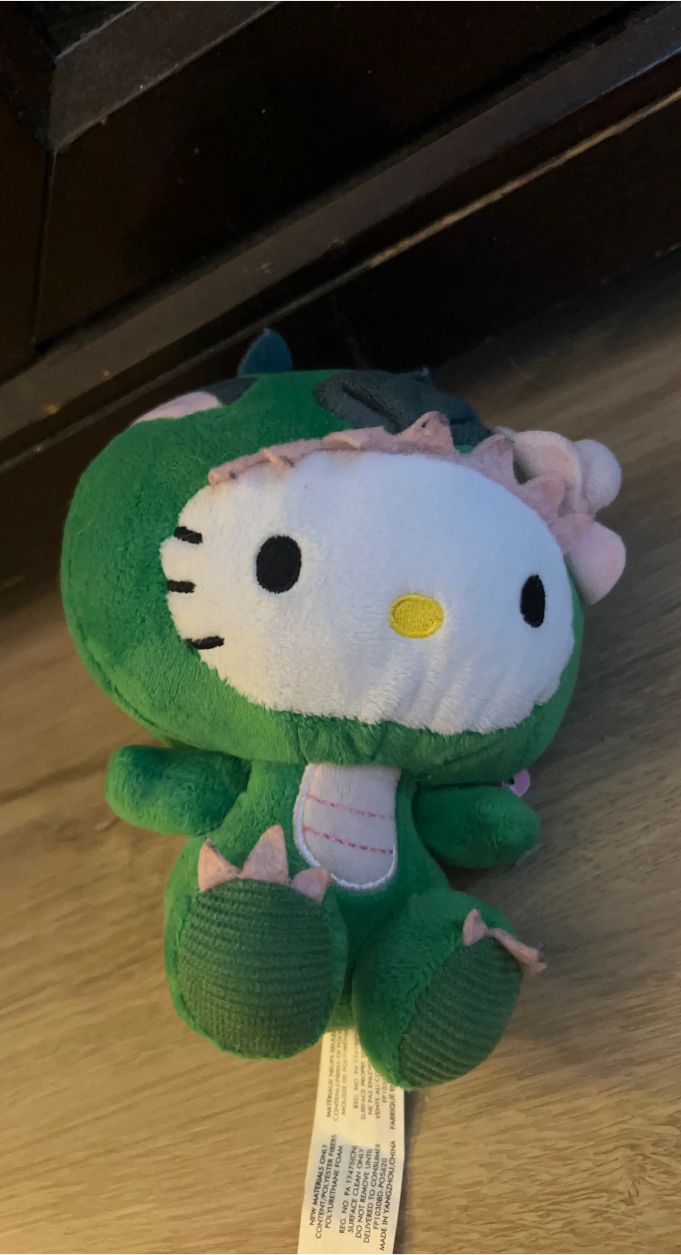 This is a cute Hello Kitty plush toy dressed as a dinosaur. It's green with pink accents and a soft, cuddly texture. Perfect for Hello Kitty fans and collectors!