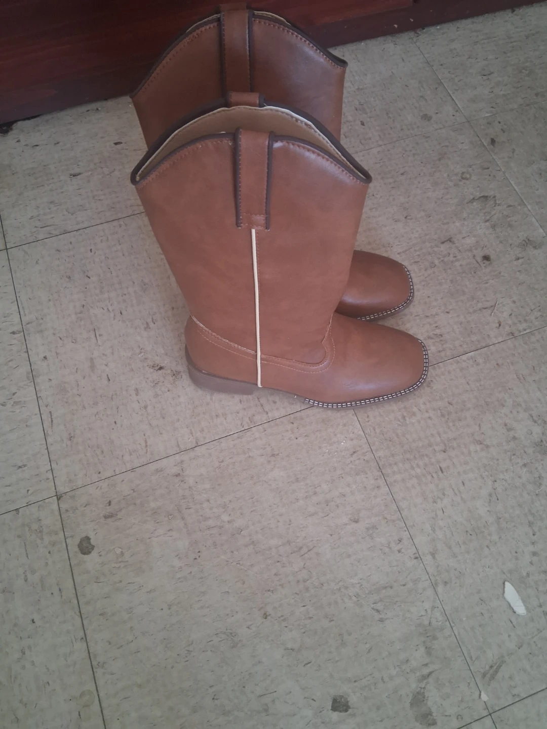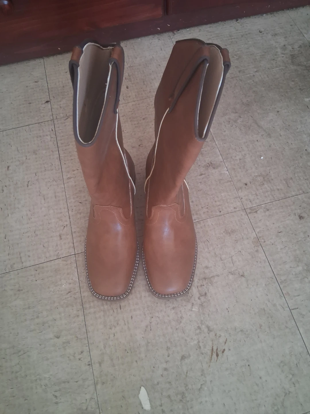 Brown cowboy boots with a square toe. These boots are a classic style, perfect for adding a Western flair to any outfit. They're made with a durable material and feature decorative stitching.
