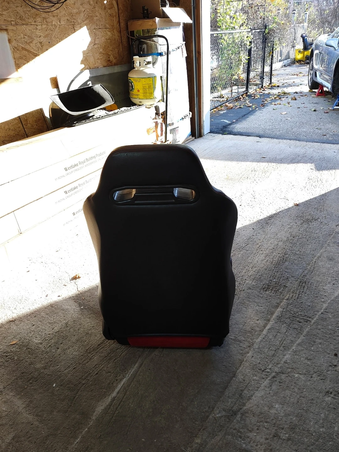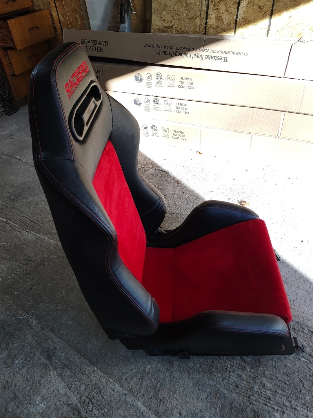 This is a Racespex racing seat with black leatherette and red fabric inserts. It's designed for performance and comfort. Mounting hardware is included.