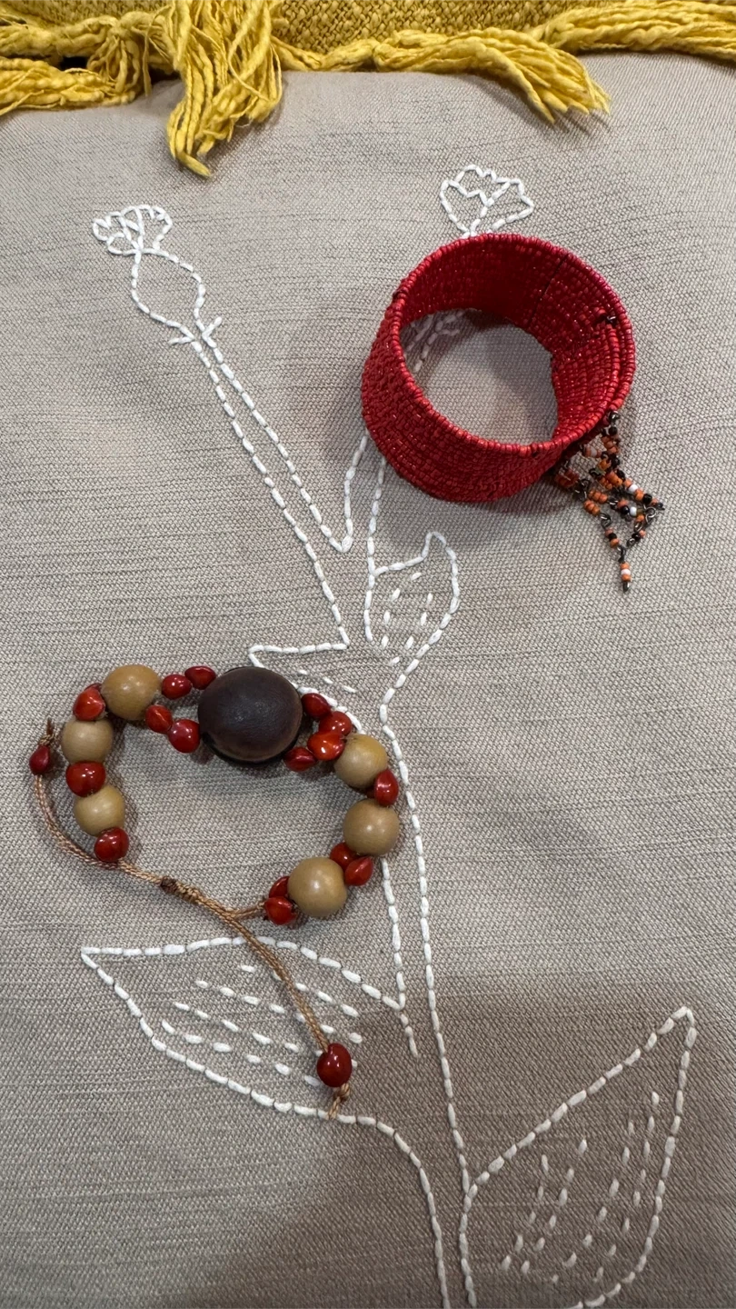 Two beautiful boho-style bracelets that can be worn together or separately. Rich red tones with natural wood beads — perfect for festivals, casual outfits, or layering with other jewelry.