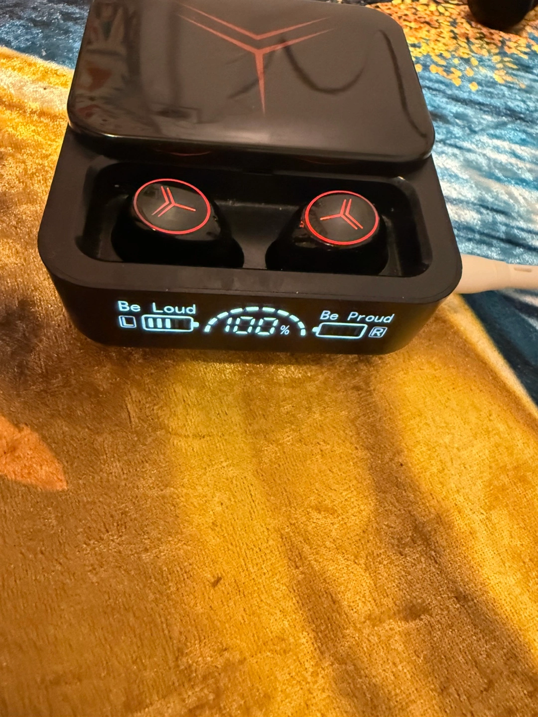 Wireless bluetooth headphones with charging case. Includes charging cable, battery last long, and often used.