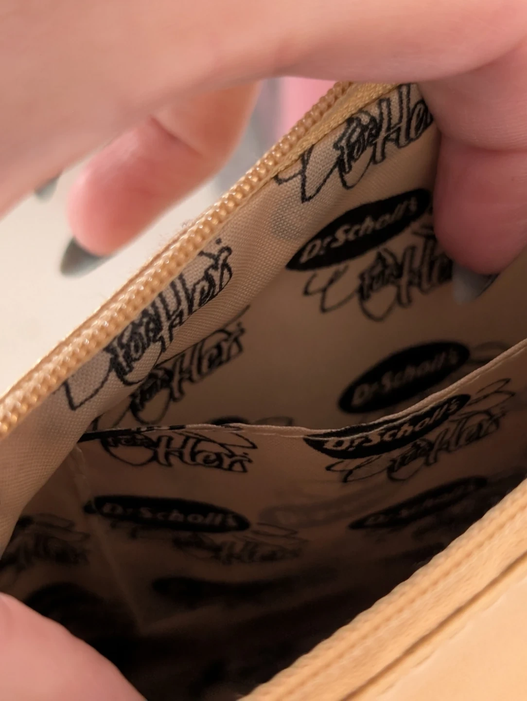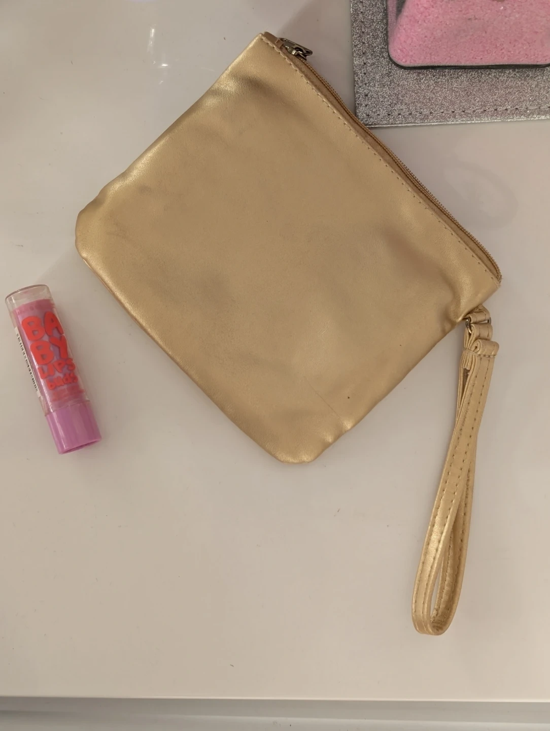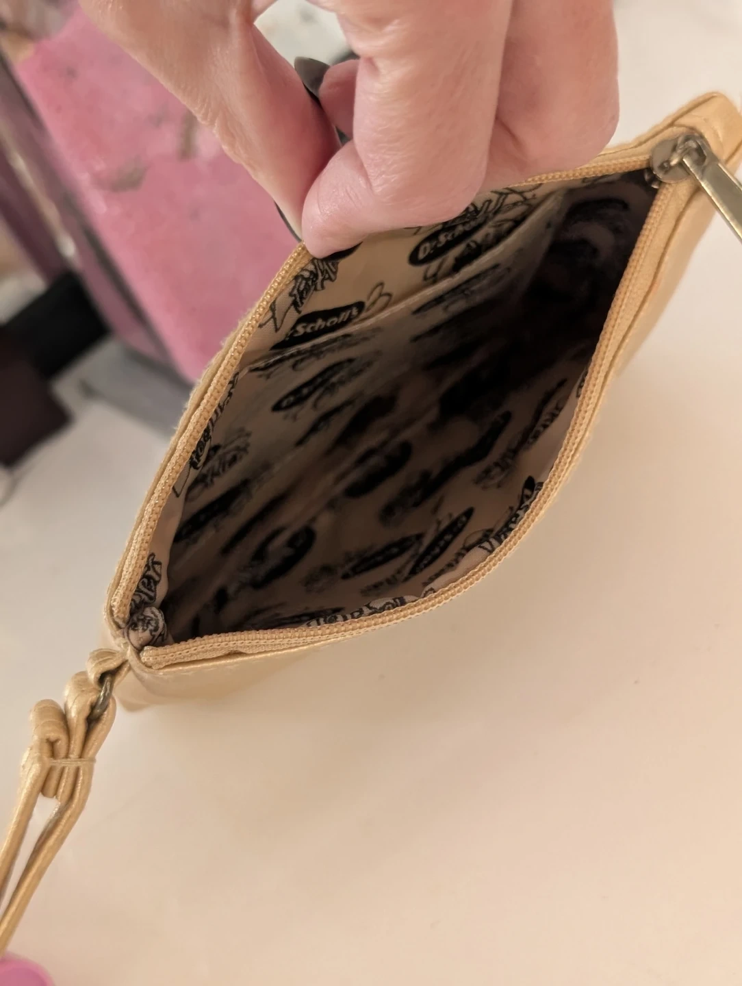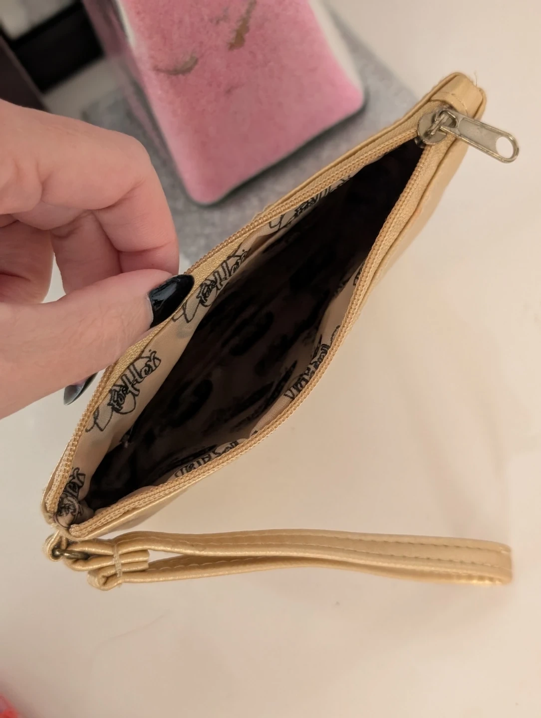 This is a gold wristlet pouch with a zippered closure. The interior lining features a repeating Dr. Scholl's logo pattern. It has a small wrist strap attached. Exact amount of Cash only please 🌸