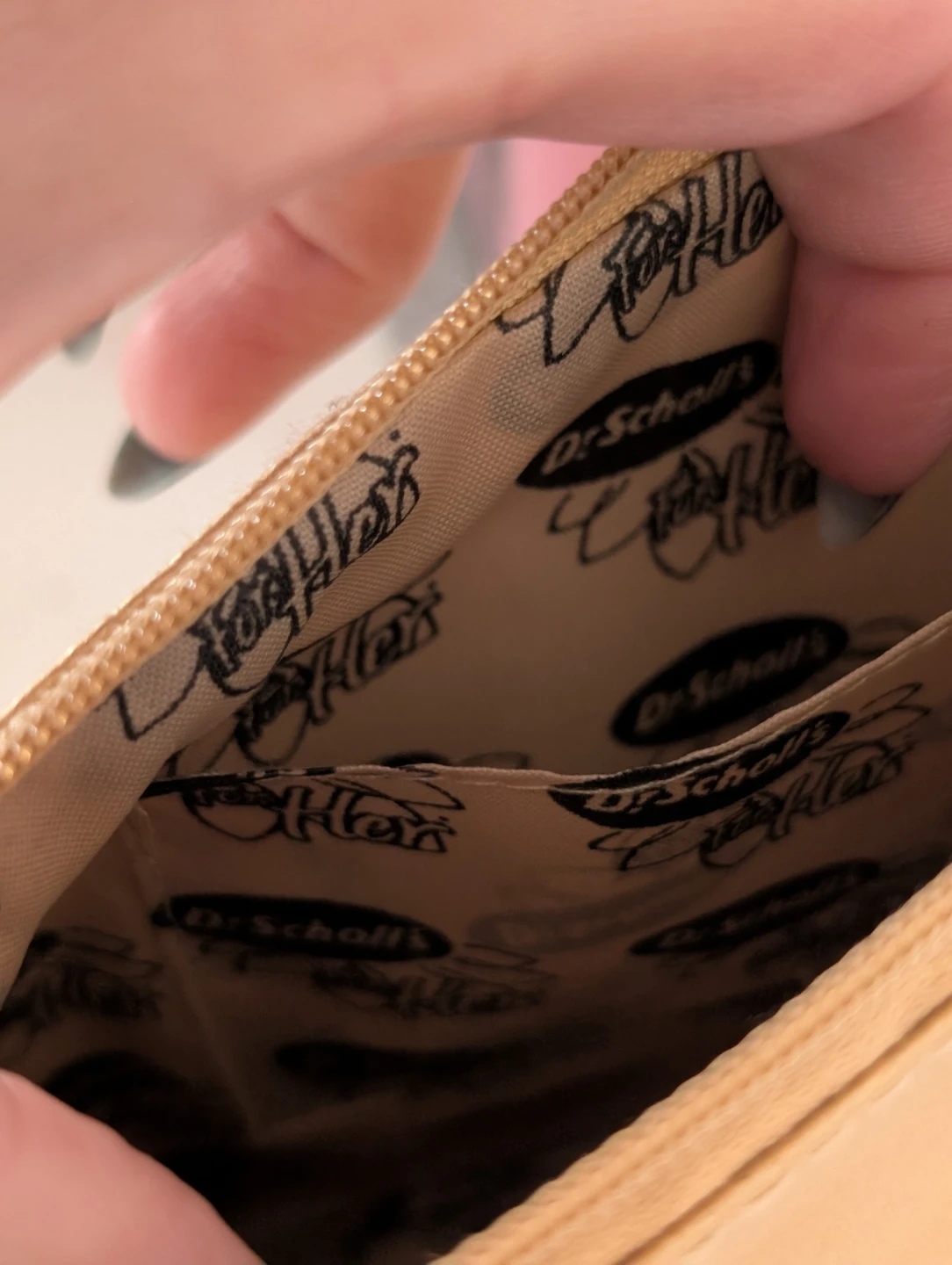 This is a gold wristlet pouch with a zippered closure. The interior lining features a repeating Dr. Scholl's logo pattern. It has a small wrist strap attached.