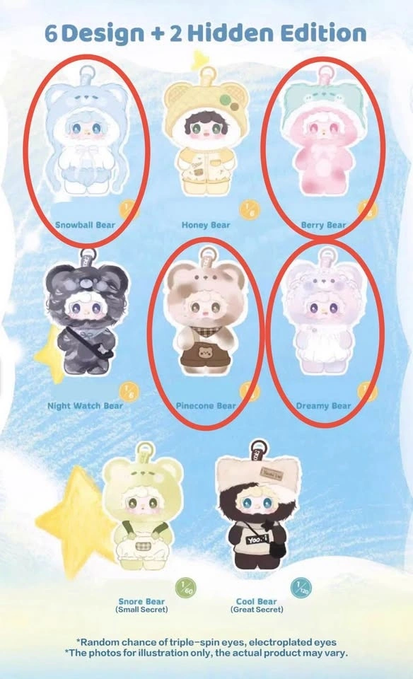 Available characters: Snowball Bear (blue), Berry Bear (pink), Pinecone Bear (brown), and Dreamy Bear (purple).