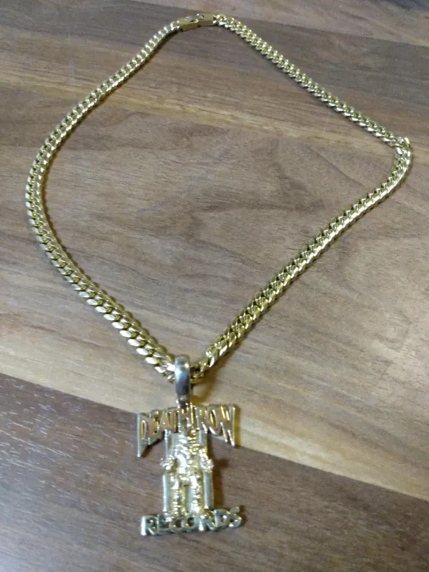 Selling a Death Row Records gold chain necklace. It features a large pendant with the Death Row Records logo and imagery. The chain is a thick, gold-coloured curb chain. A cool piece for any hip-hop fan!