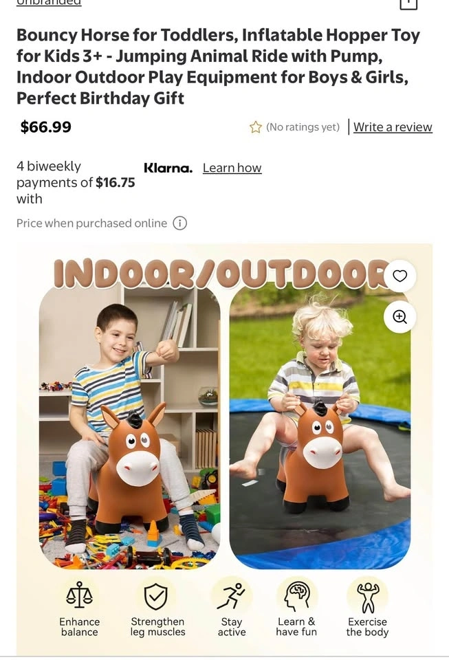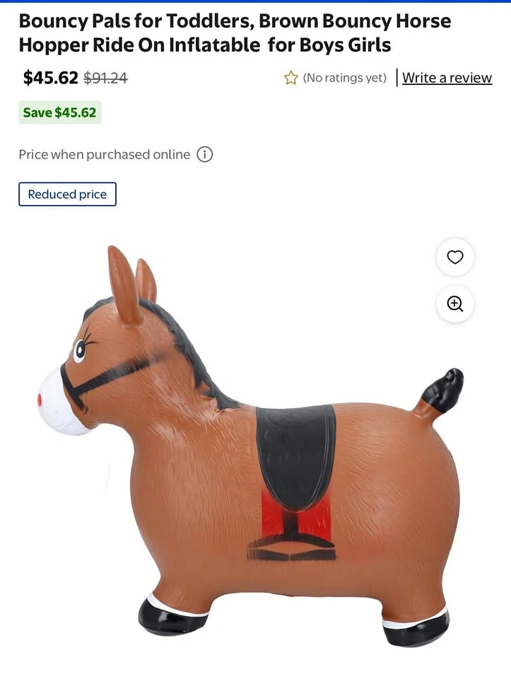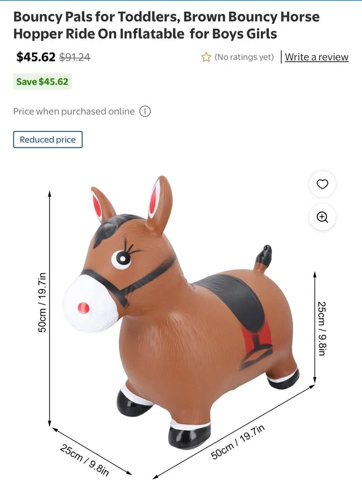 Buy & SellBouncy horse for toddlersBouncy horse for toddlers$20Bouncy Pals for Toddlers, Brown Bouncy Horse Hopper Ride On Inflatable. Let me know if you're interested!WHERE TO MEETCheck LocationView MapSELLERLucyGarner100 reviews0 chats·0 favorites·2 viewsSEND CHAT TO SELLERHi Lucy! I’m interested in your listing.Hi Lucy! I’m interested in your listing.Get the Karrot app to chatSign In to chat
